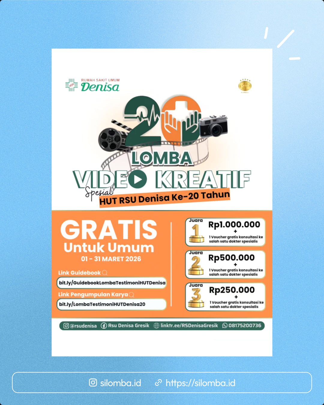 Kami mengundang masyarakat umum untuk ikut Lomba Video Kreatif dalam rangka HUT RSU Denisa ke-20!