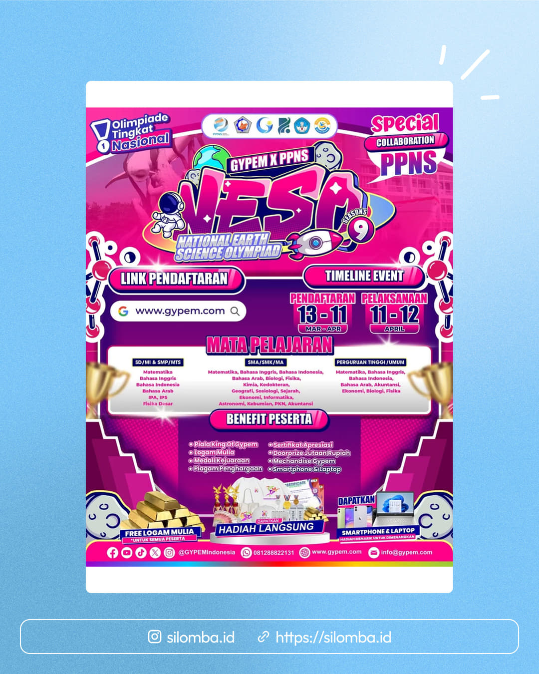 Subscribe Youtube "Gypem Indonesia"Follow TikTok gypemnesia & gypemindonesia dan Instagram gypemindonesiaMention teman kamu minimal 7 orang dalam kolom komentar di postingan gypemindonesiaLike dan Share postingan ini di medsos kamu (ig/fb/twitter) dengan tag gypemindonesia dan pastikan akun kalian tidak di privateUpload seluruh bukti persyaratan di formulir pendaftaranPeserta WAJIB membaca JUKNIS sebelum mendaftar