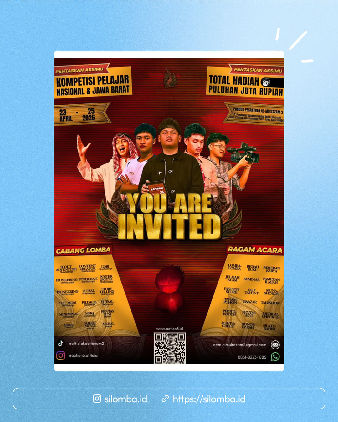 โ๐ OPEN REGISTRATION: ACTION 2026 ๐ โSiapkan delegasi terbaikmu untuk bersinar di Al-Multazam 2 Islamic & Creative Competition! Saatnya pemuda bergerak melampaui batas dan meraih cahaya prestasi. โโจ Main Theme: โโAksi Melaga Gulita, Pentas Diri Galakaryaโ โ๐ Waktu: 23-25 April 2026 ๐ Lokasi: Pondok Pesantren Terpadu Al-Multazam 2, Kuningan โ๐ Kategori Lomba: โSD/MI: Futsal, MHQ, Mewarnai, Pildacil. โSMP/MTs: Futsal, Story Telling, LCC MIPAI, Pioneering, Poster Digital. โSMA/MA: Scout Adventure, Pioneering, LDBI, Content Creator, Fotografi. โ๐ Total Hadiah: โ๐ฐ Rp30.000.000++ โ๐ฅ Jangan Sampai Ketinggalan! Nikmati juga: Talkshow, Seminar, Konser Amal, & Food Festival. โ๐ Daftar Sekarang: [www.action3.id] ๐ Info Lomba: 0851-8333-1825 โ#ACTION2026 #AlMultazam2 #LombaNasional #LombaJawaBarat #EventKuningan Silomba hanya media informasi lomba. Untuk info lebih lanjut, silakan hubungi penyelenggara.