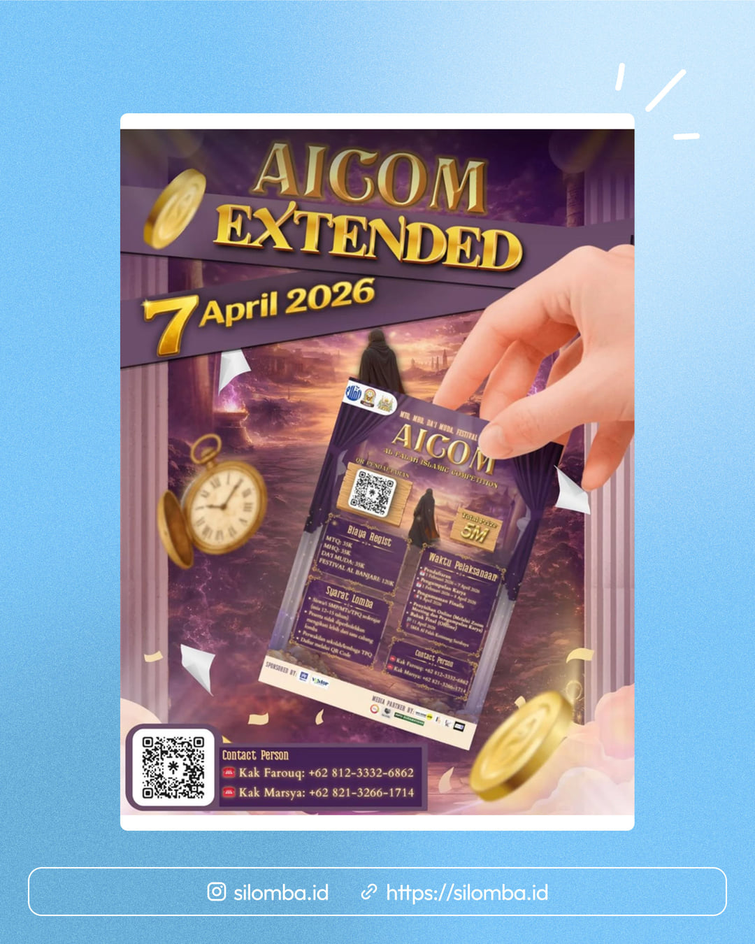 AICOM Extended hadir bukan sekadar lanjutan, tapi langkah baru untuk bertumbuh bersama dalam kebaikan π Di sini, setiap ide menjadi amal, setiap kolaborasi bernilai ibadah π€, dan setiap langkah diarahkan untuk membawa manfaat bagi sesama. Kami percaya, perubahan yang baik dimulai dari niat yang tulus dan usaha yang konsistenβkarena sekecil apa pun kebaikan, tetap berarti di hadapan-Nya β¨ Saatnya bergerak, berkembang, dan berkarya bersama dalam nilai-nilai kebaikan melalui AICOM Extended π± πΎπ€π£π©πππ© πππ§π¨π€π£ Kak Farouq: +62 812-3332-6862 Kak Marsya: +62 821-3266-1714 More information? Take a peek at πΆ : @/osissmalfasby on Tiktok πΈ : ski_smalfalah and smalfaosis on Instagram! #lombasmp #lombaislami #lombamts #lomba #lombaupdate Silomba hanya media informasi lomba. Untuk info lebih lanjut, silakan hubungi penyelenggara.