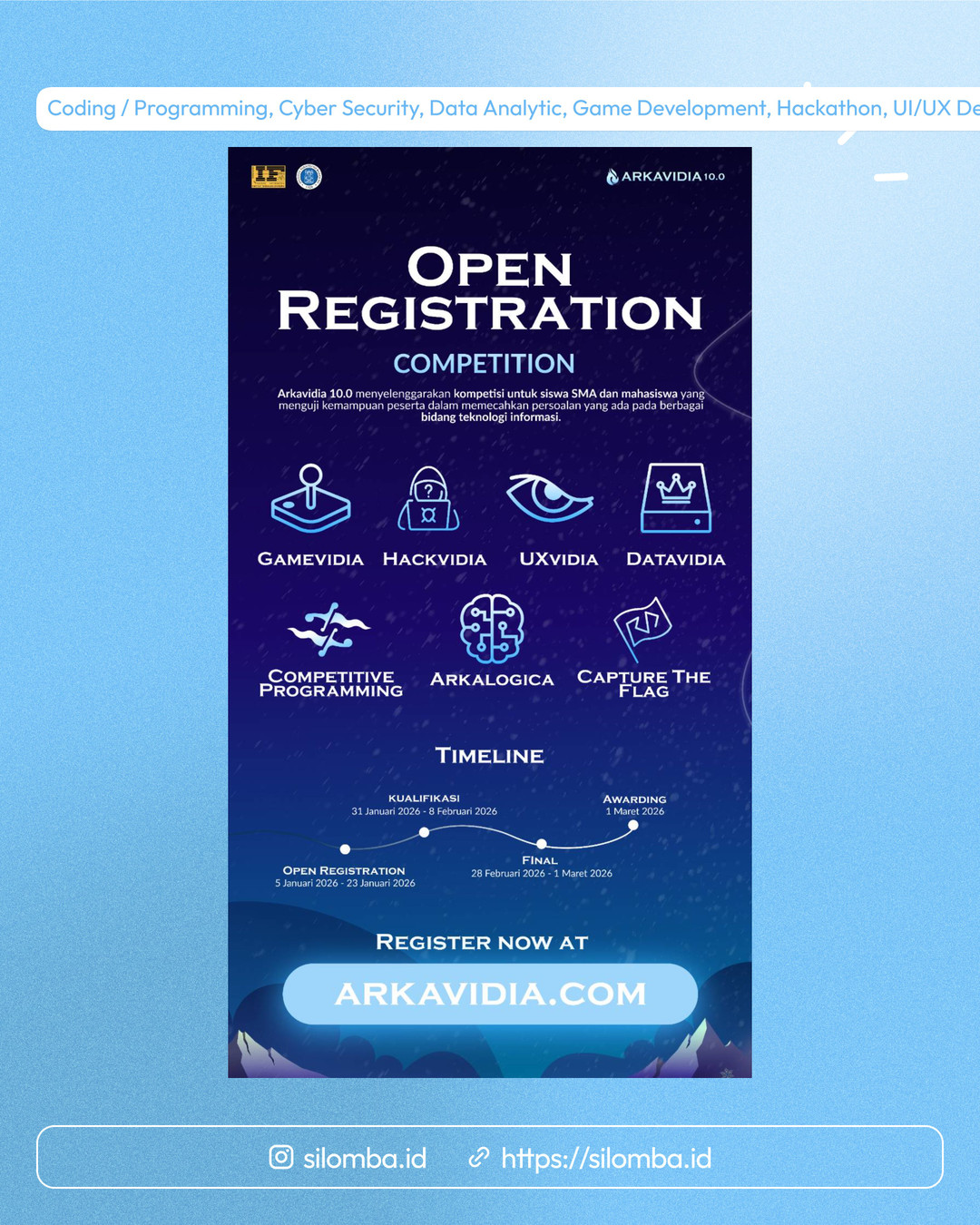 Mulai dari adu logika dan kecepatan berpikir, eksplorasi data, keamanan siber, hingga perancangan desain UX dan pengembangan produk digital. Setiap cabang lomba dirancang untuk mengasah skill kamu yang dibutuhkan di industri! Temukan kategori lombamu dan buktikan bahwa kamu siap bersaing di level berikutnya bersama Arkavidia 10.0! ๐