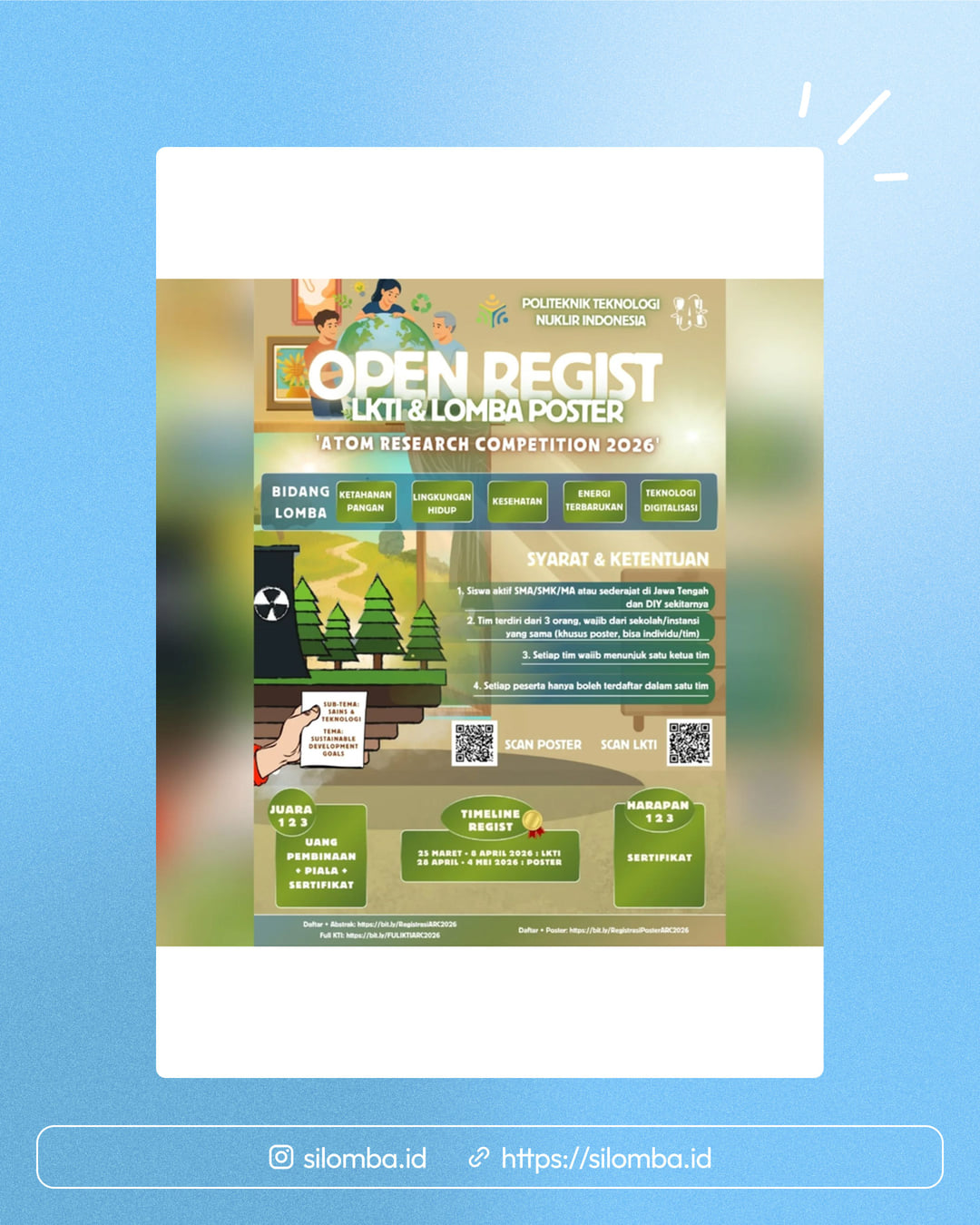 Tim terdiri dari 3 orang, wajib dari sekolah/instansi yang sama (khusus poster, bisa individu/tim)Setiap tim wajib menunjuk satu ketua timPeserta hanya boleh mendaftar dalam satu tim