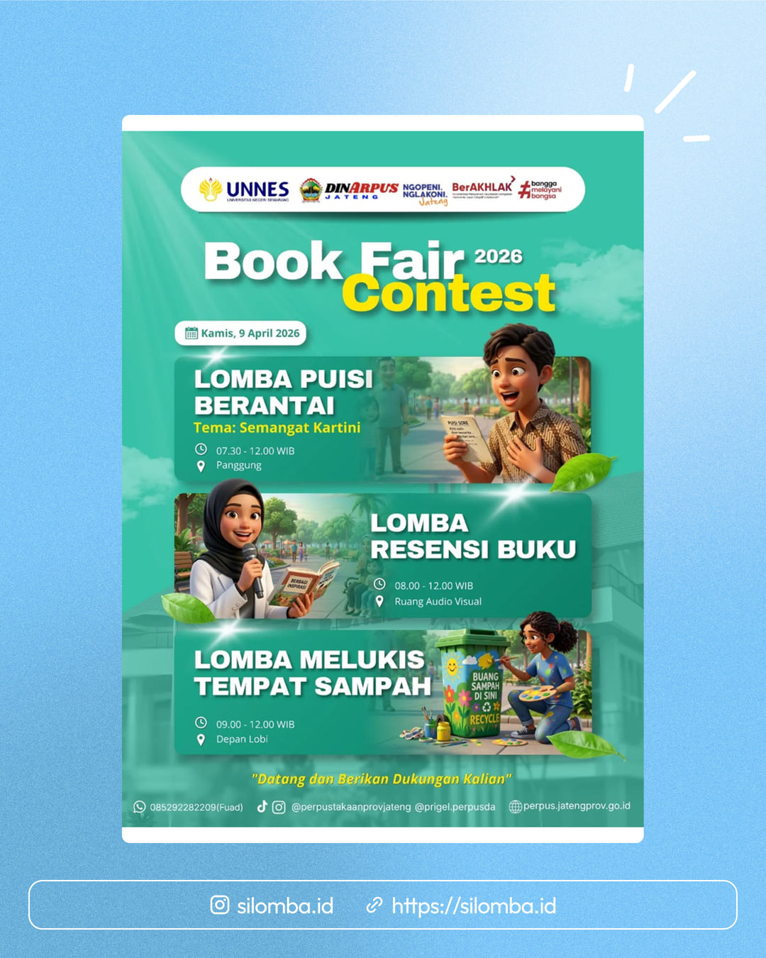 Hari Kamis ini bakalan super seru dan penuh kreativitas di Book Fair Perpusda Jateng 2026! Bakal ada tiga perlombaan menarik yang siap menguji bakat dan imajinasi para peserta. š¤©āØ