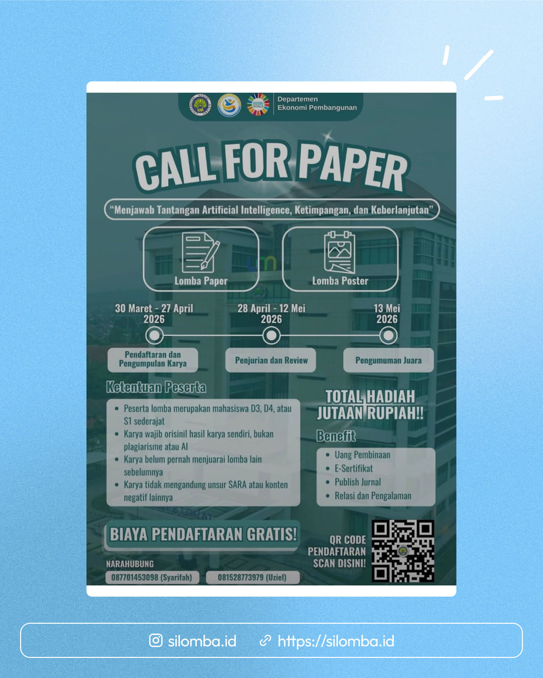 Mahasiswa D3/D4/S1Karya orisinal (NO plagiarisme & NO AI)Belum pernah juara sebelumnyaBebas dari unsur SARA & konten negatif