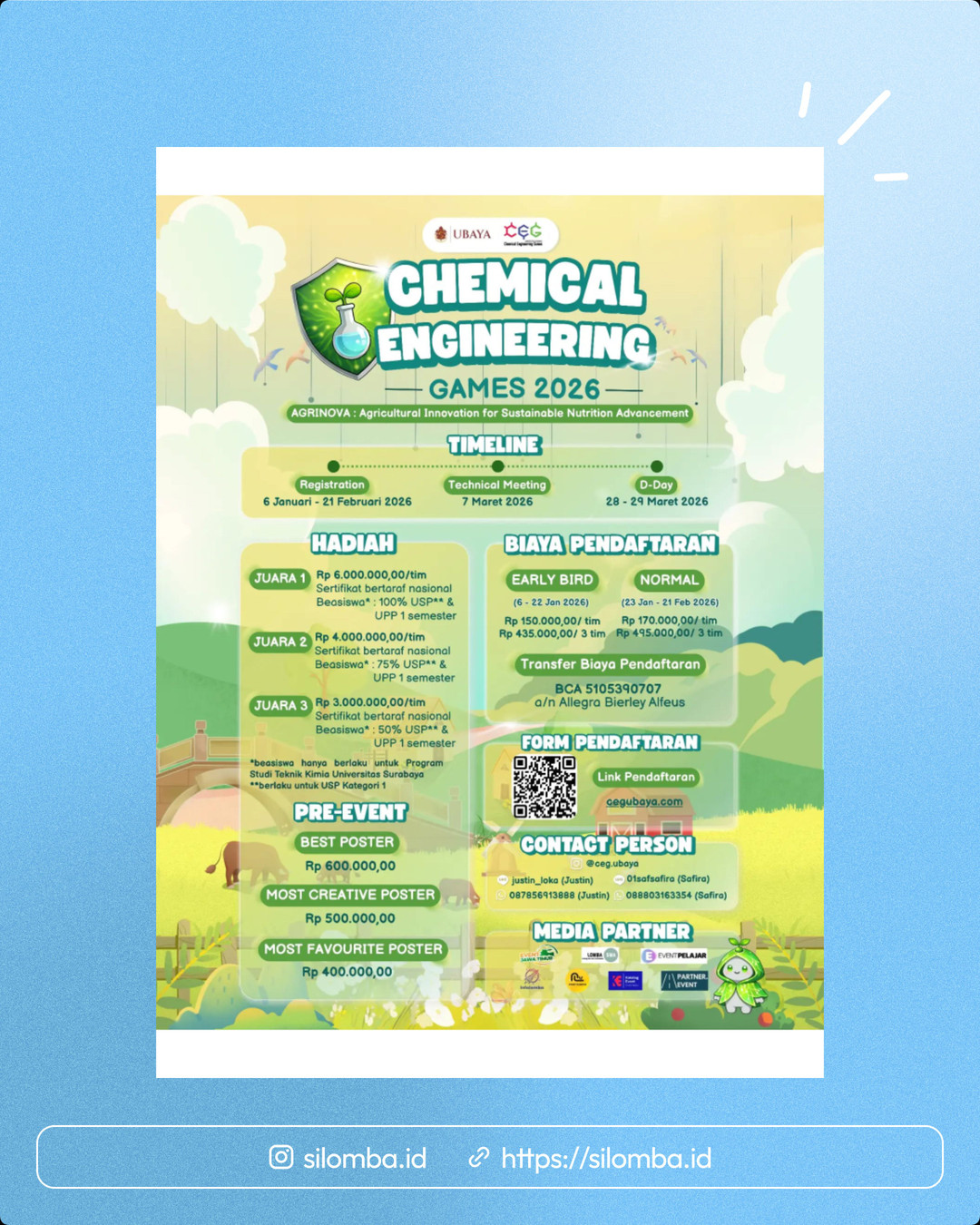 ‼️Chemical Engineering Games 2026‼️ hadir kembali dengan konsep OFFLINE yang dikemas melalui rangkaian games edukatif dan pastinya sangat seru🤯 Selain menambah wawasan, peserta juga akan mengikuti berbagai permainan menarik serta berkesempatan memperoleh hadiah JUTAAN Rupiah dan BEASISWA di Program Studi Teknik Kimia Universitas Surabaya.🤩👩🎓