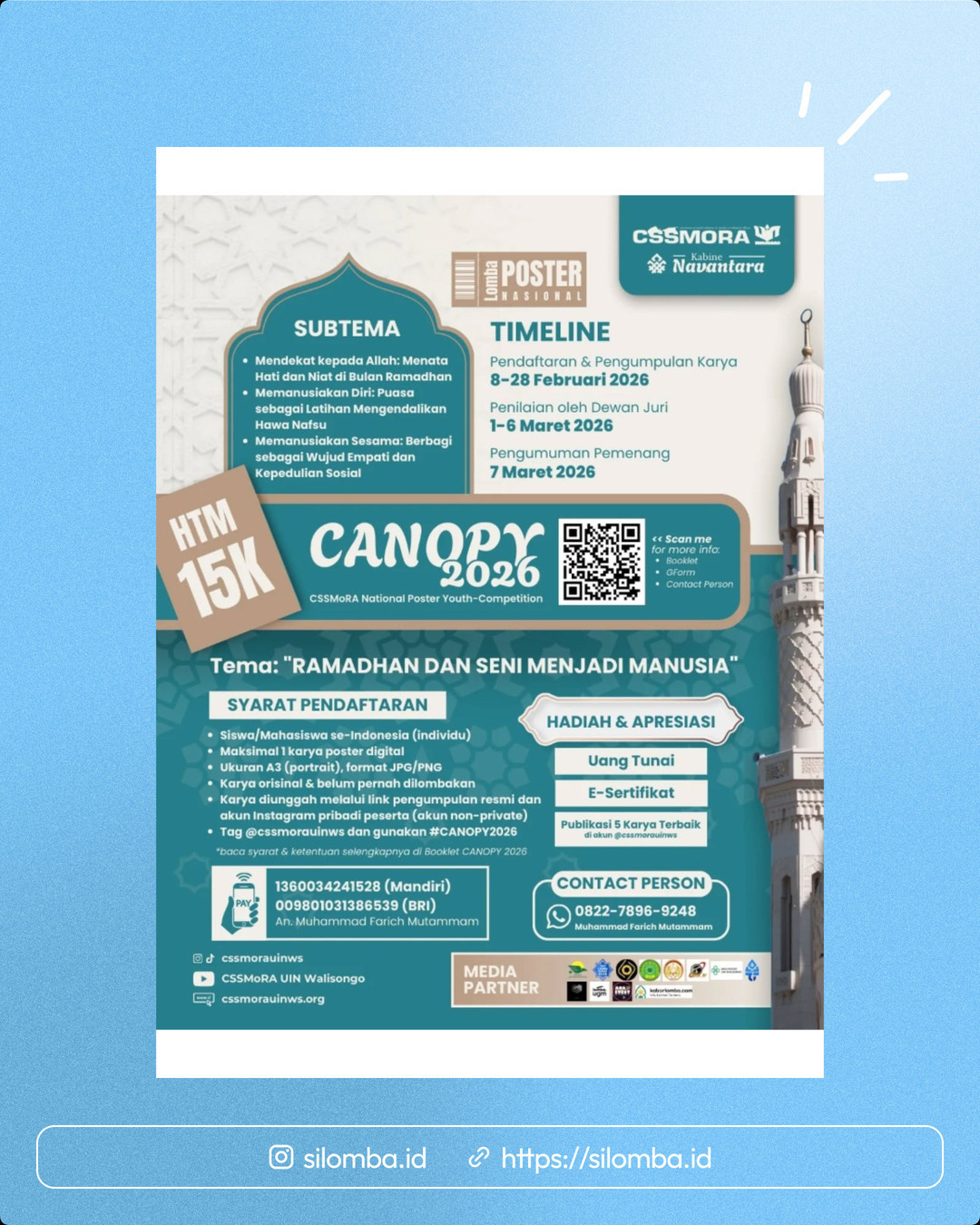yang diselenggarakan oleh CSSMoRA UIN Walisongo Semarang, hadir sebagai wadah bagi pelajar dan mahasiswa se-Indonesia untuk menuangkan gagasan, refleksi, dan nilai kemanusiaan melalui karya poster.
