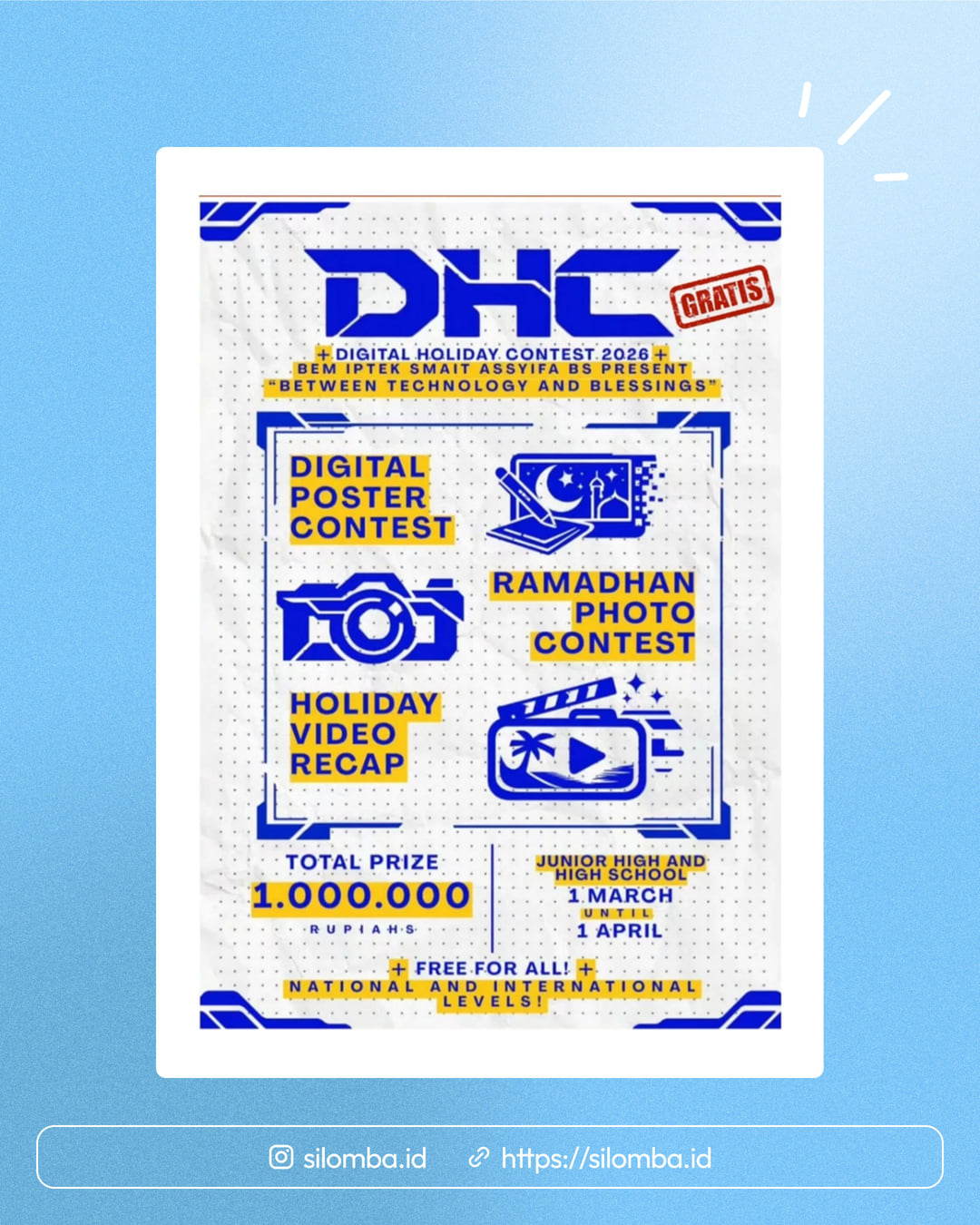 Buat kamu yang punya skill FOTOGRAFI, VIDEOGRAFI, dan DESAIN GRAFIS. Serta kamu yang ingin MENAMBAH PENGALAMAN DAN MENGASAH BAKAT selama liburan di Ramadhan, Buruan ikut DHC dan menangkan total hadiah sebesar 1 JUTA RUPIAH!!!