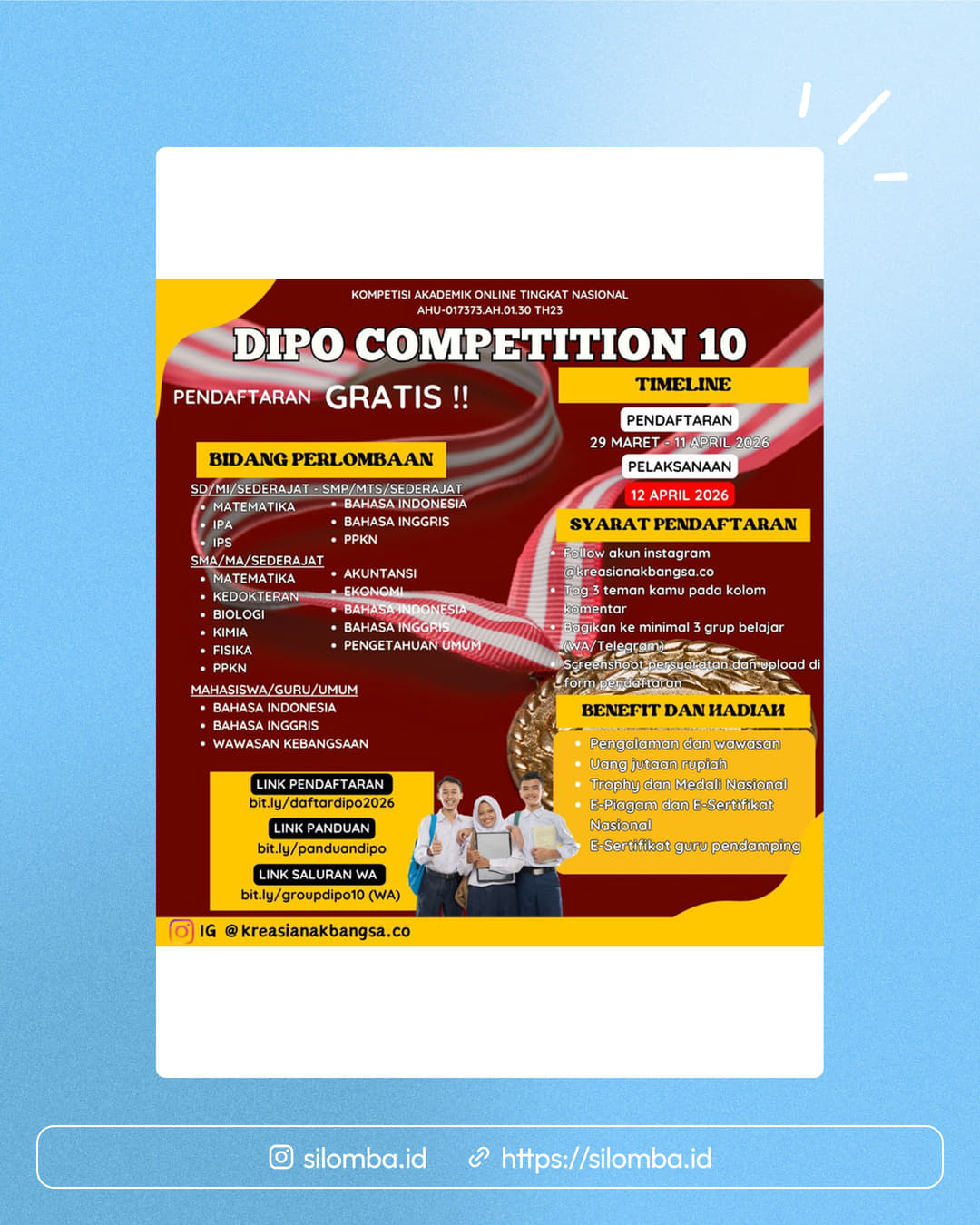 Follow IG kreasianakbangsa.coShare poster ke group chat kamuDaftar pada link: bit.ly/daftardipo2026