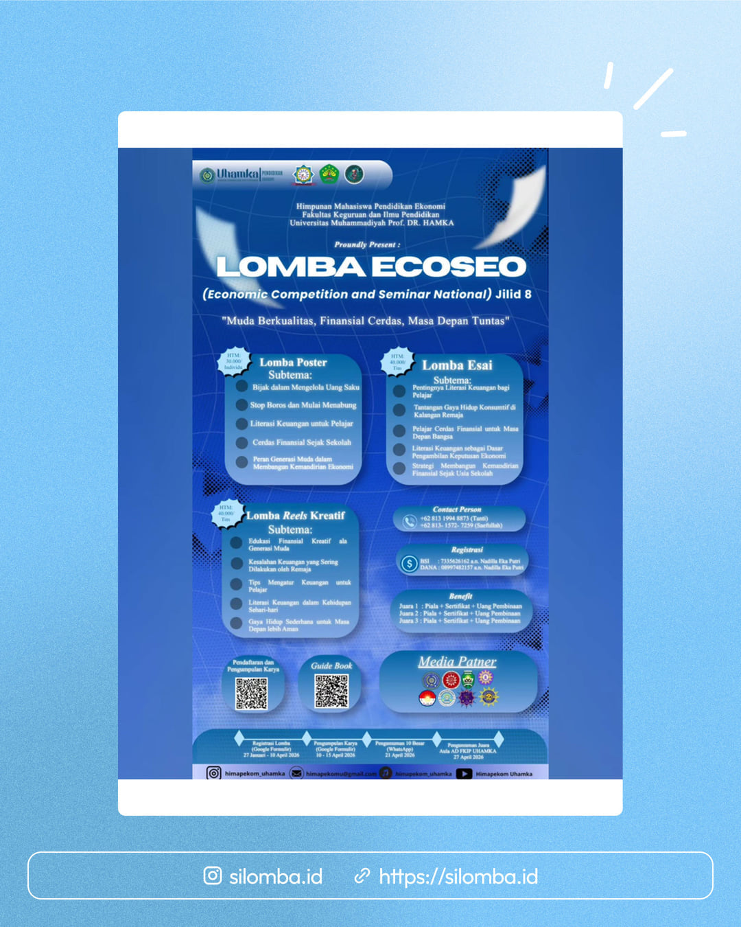 β¨πΌπ¨π¨ππ‘ππ’πͺππ‘πππ πͺπ’ πππ§πππ’ππ©πͺπ‘π‘πππ πππππ§ππ ππ©πͺπβ¨ π Halo Generasi Muda Cerdas Finansial! π₯ECOSEO JILID 8 ππ ππππ!π₯ ECOSEO Jilid 8 merupakan ajang kompetisi nasional yang siap mengasah kreativitas, pemikiran kritis, dan kepedulianmu terhadap literasi keuangan! πSiapkan karya terbaikmu dalam: π¨ Poster π Esai π₯ ππ¦π¦ππ΄ Kreatif Karena masa depan yang tuntas dimulai dari finansial yang cerdas π°β¨ π Registrasi : 27 Januari β 10 April 2026 π ππ¦π―π¦π§πͺπ΅ : Piala + Sertifikat + Uang Pembinaan _LINK_ Pendaftaranπ https://holy-lavender-czyihhw5a1.edgeone.app/ECOSEO%20JILID%208_20260201_160058_0000.pdf _LINK_ Buku Panduanππ» https://drive.google.com/file/d/1jM7edcyLjtZCTzRwzuZVhmdf7LKWIPd0/view?usp=drivesdk π±ππ°π―π΅π’π€π΅ ππ¦π³π΄π°π―π΄: 1. +62 813-1994-8873 (Tanti Erina) 2. +62 813-1572-7259 (Saefulloh Filjana) βΌοΈ ππ°π³π¦ Info: β’ IG: ecoseo_uhamka β’ IG: himapekom_uhamka βοΈ Email: himapekomu@gmail.com π½ YouTube: Himapekom Uhamka πͺ TikTok: himapekom_uhamka Jangan cuma jadi penonton, jadilah juara! β¨πππ¨π¨ππ‘ππ’πͺππ‘πππ πͺπ’ πππ§πππ’ππ©πͺπ‘π‘πππ πππππ§ππ ππ©πͺπβ¨ #ECOSEOJilid8 #HimaPekom #SeminarNasional #LombaNasional #LiterasiFinansial GenerasiCerdas Silomba hanya media informasi lomba. Untuk info lebih lanjut, silakan hubungi penyelenggara.