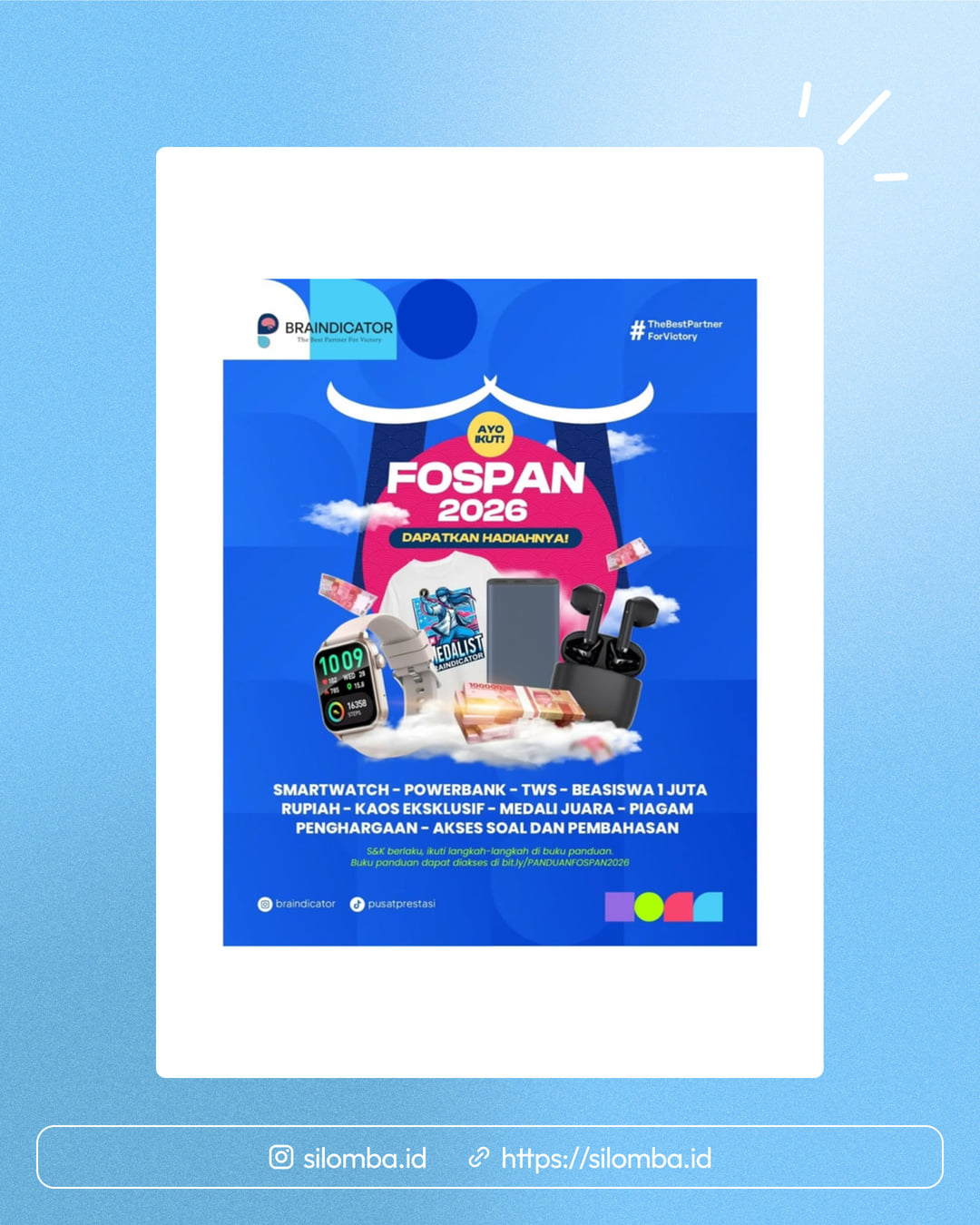 Piagam Penghargaan untuk meningkatkan Portofolio, Beasiswa 1 juta untuk 2 orang pemenang, Powerbank, TWS, Smartwatch, Kaos Lembaga Braindicator