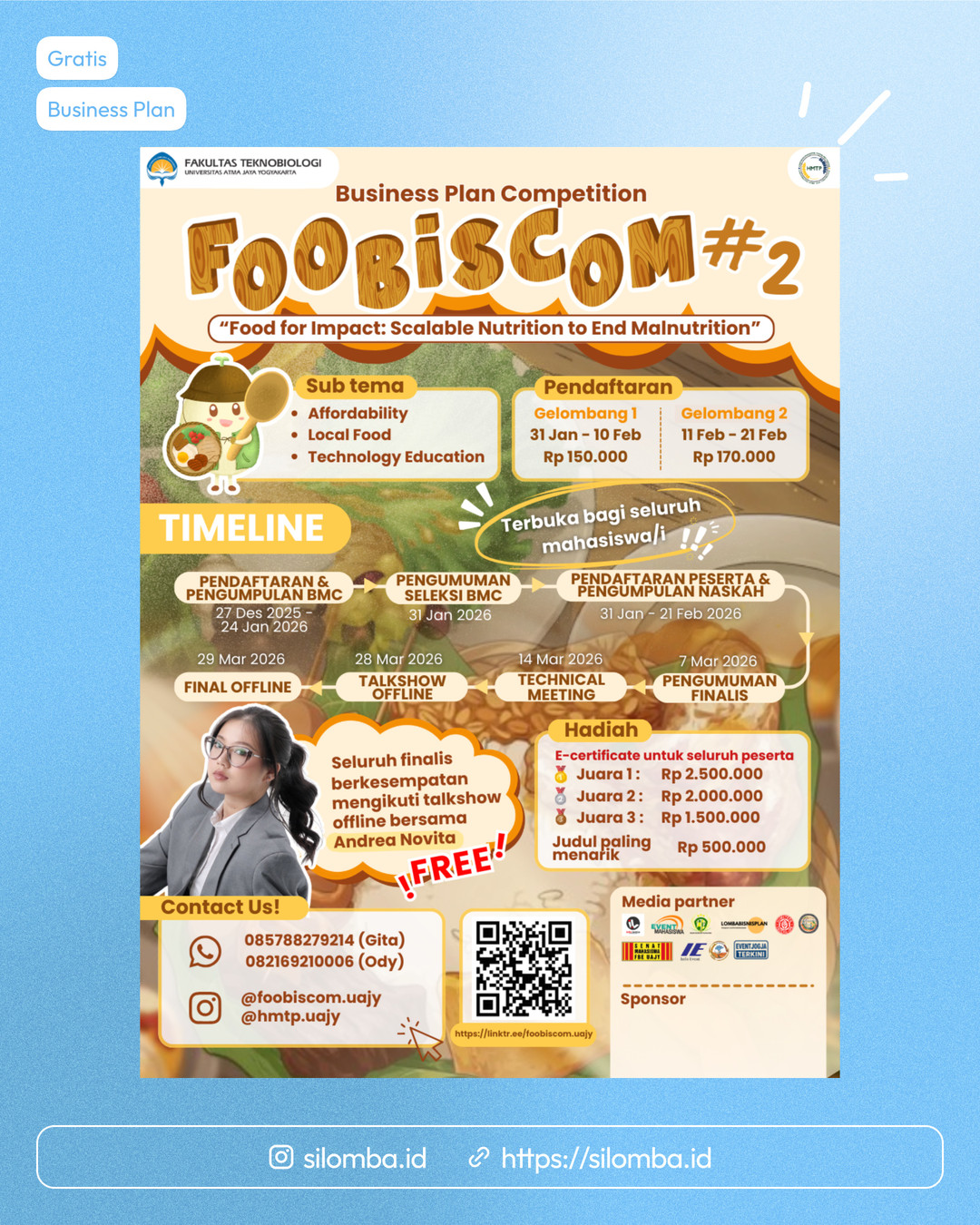HMTP UAJY kembali lagi dengan lomba Business Plan Competition yang pastinya ga kalah seru dengan tahun lalu๐ง๐. Tema yang diangkat yaitu "Food for Impact: Scalable Nutrition to End Malnutrition"๐ฒ๐ซ. Para Finalis juga berkesempatan untuk ikut talkshow offline bareng Andrea Novita lohh. Jangan sampe ketinggalan yaaโผ๏ธ๐