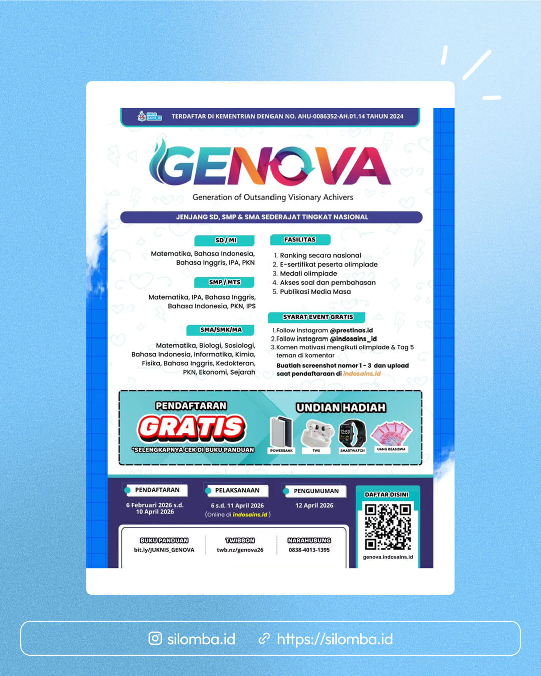 Follow Instagram prestinas.idFollow Instagram indosains_idKomentar motivasi mengikuti olimpiade & tag 5 teman di kolom komentar!Screenshot poin 1โ3 dan upload saat pendaftaran di indosains.id