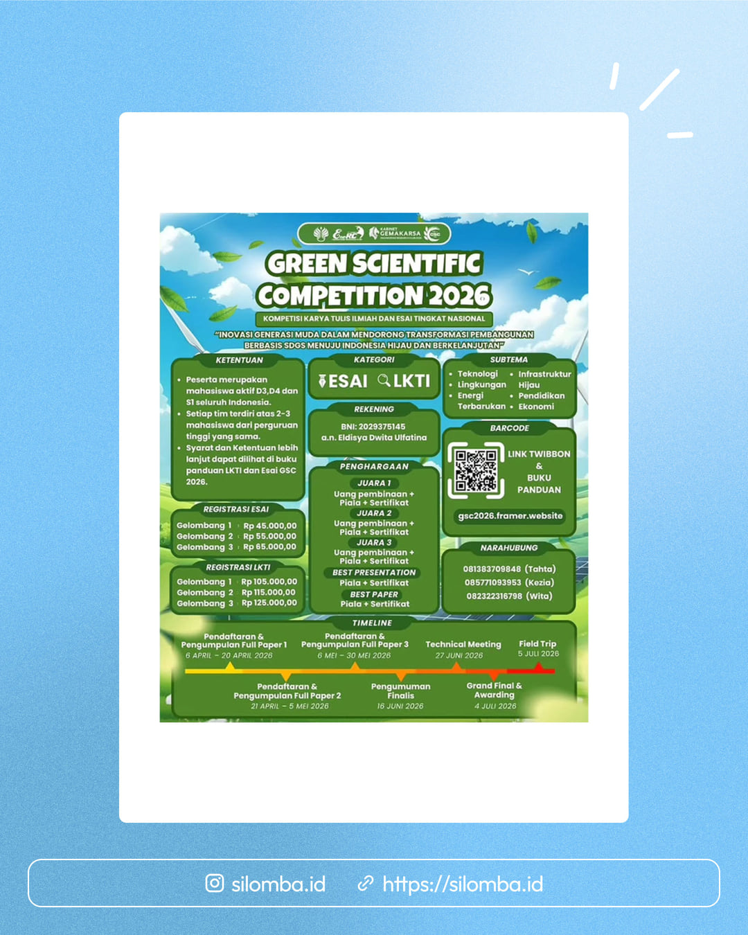 Peserta merupakan mahasiswa aktif D3, D4 dan S1 seluruh Indonesia.Setiap tim terdiri atas 2-3 mahasiswa dari perguruan tinggi yang sama.Syarat dan ketentuan lebih lanjut dapat dilihat di buku panduan LKTI dan Esai GSC 2026.