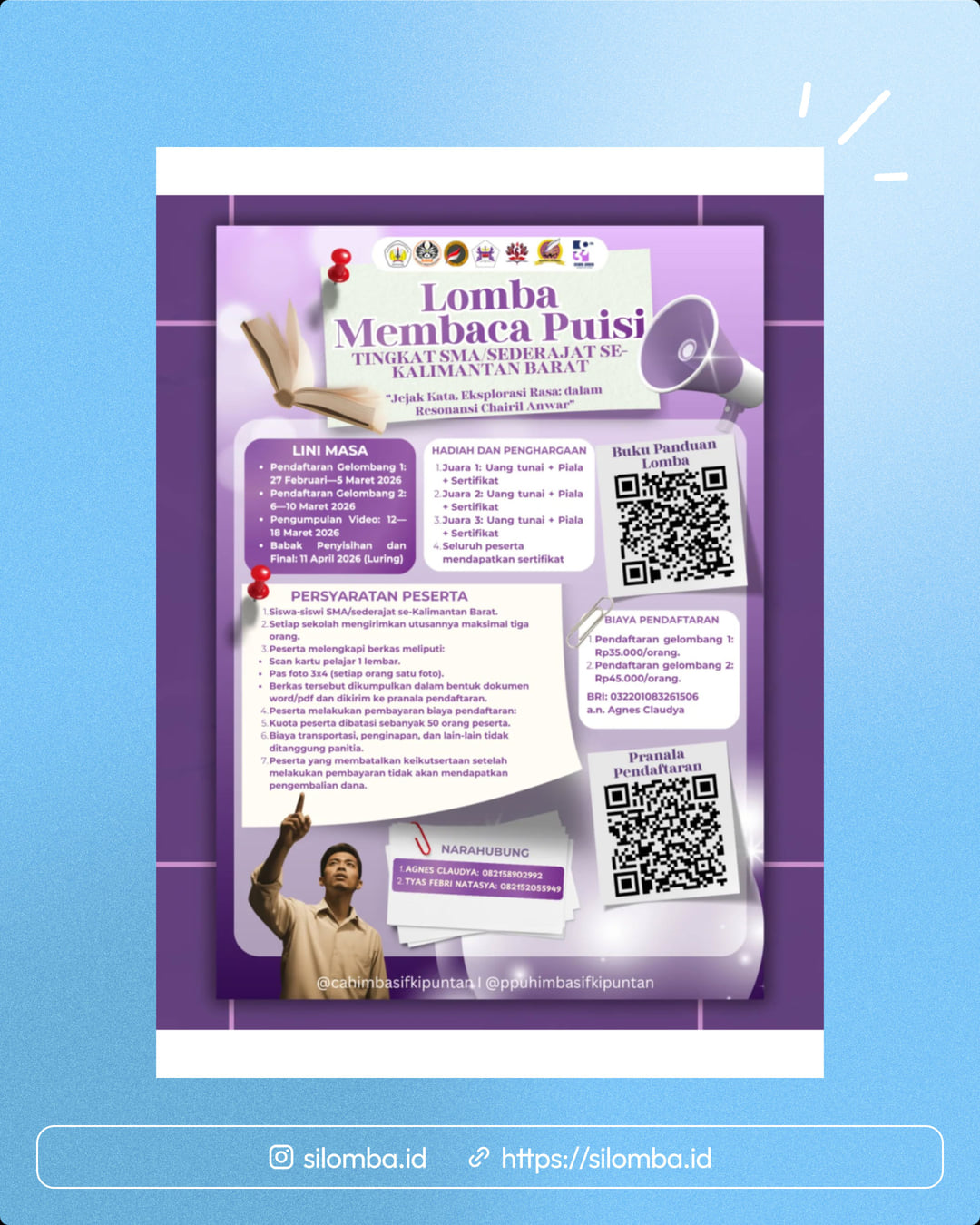 Siswa-siswi SMA/sederajat se-Kalimantan Barat, inilah kesempatanmu untuk bersinar dalam Lomba Membaca Puisi tingkat SMA/sederajat. Jadilah bagian dari acara yang memukau ini!