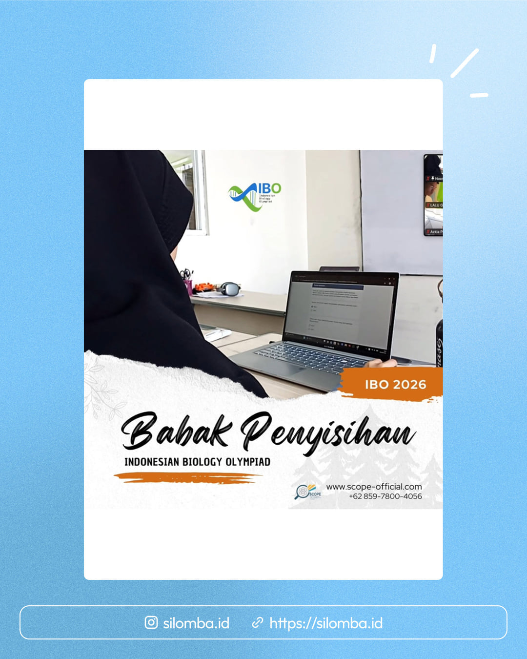 Hari ini, Sabtu, 4 April 2026, Scope Official menggelar Babak Penyisihan Indonesian Biology Olympiad (IBO)! Selain kompetisi, pemenang IBO nantinya bakal dapet pelatihan eksklusif untuk mematangkan persiapan menuju OSN Biologi 2026. Siapkan dirimu jadi juara!"