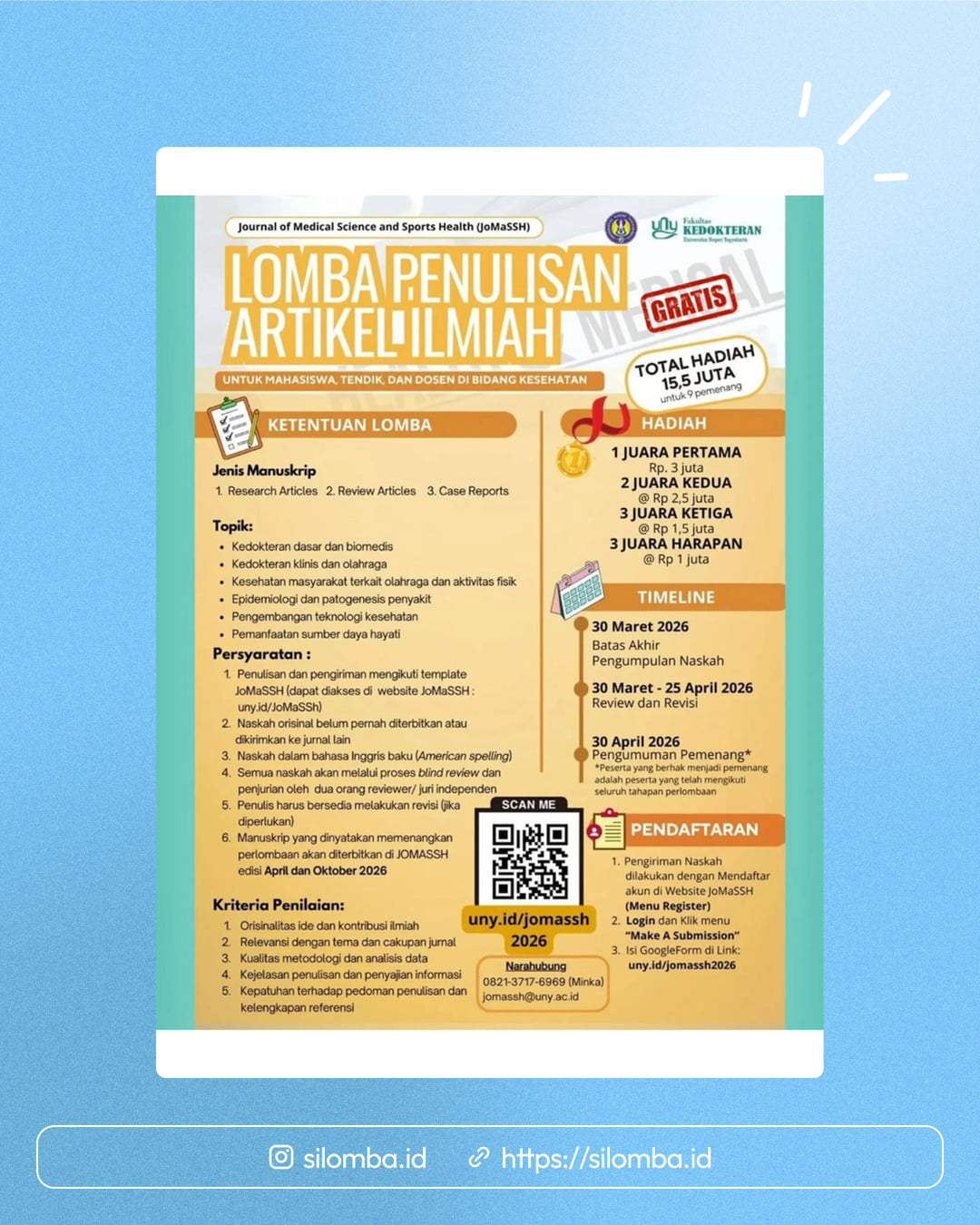 Register akun di website JoMaSSHIsi Google Form pendaftaran: uny.id/jomassh2026