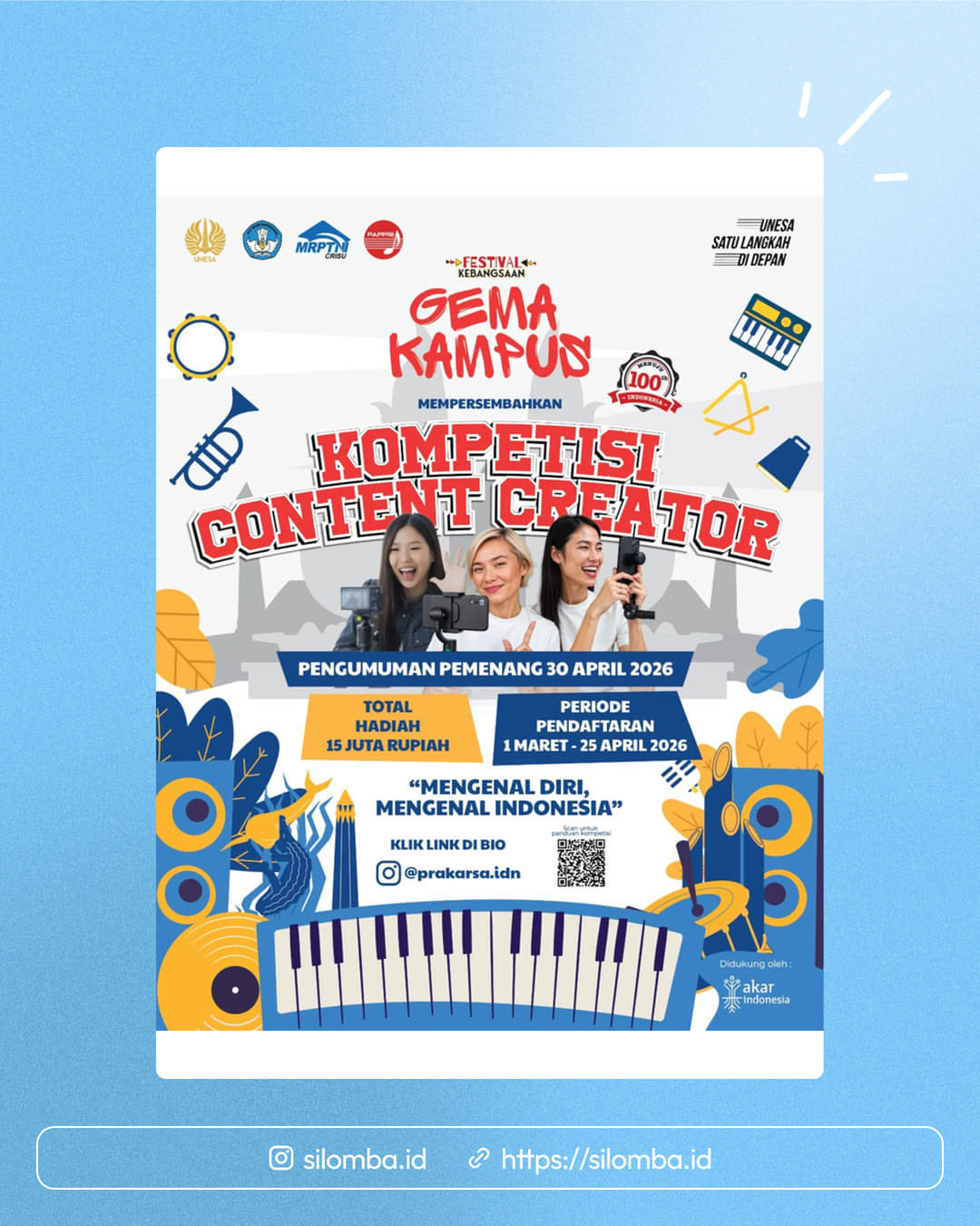 โBuktikan lewat karya terbaikmu di ๐๐จ๐ฆ๐ฉ๐๐ญ๐ข๐ฌ๐ข ๐๐จ๐ง๐ญ๐๐ง๐ญ ๐๐ซ๐๐๐ญ๐จ๐ซ ๐ ๐๐ฌ๐ญ๐ข๐ฏ๐๐ฅ ๐๐๐๐๐ง๐ ๐ฌ๐๐๐ง ๐๐๐๐ ๐๐๐ฆ๐ฉ๐ฎ๐ฌ! Bikin konten paling kreatif dengan tema "Mengenal Diri, Mengenal Indonesia" dan bawa pulang total hadiah ๐๐ ๐๐๐๐ ๐๐๐๐๐๐!๐โจ