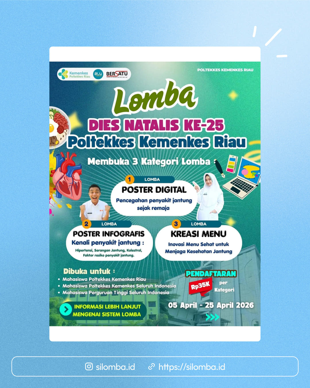 Punya kreativitas di bidang visual atau jago meracik menu sehat? Ini saatnya kamu unjuk gigi! Poltekkes Kemenkes Riau mengundang kamu untuk bergabung dalam kompetisi bergengsi tahun ini dengan tema kesehatan jantung.