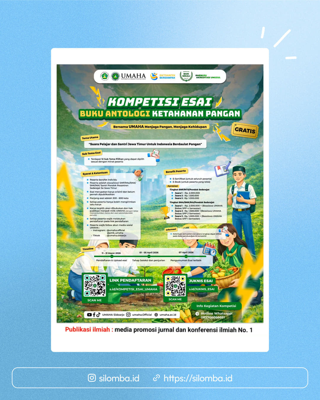 Esai merupakan karya orisinal dan belum pernah dipublikasikan.Siswa SMP/MTs/SMA/SMK/MA/Santri pondok pesantren sederajat se Jawa Timur.