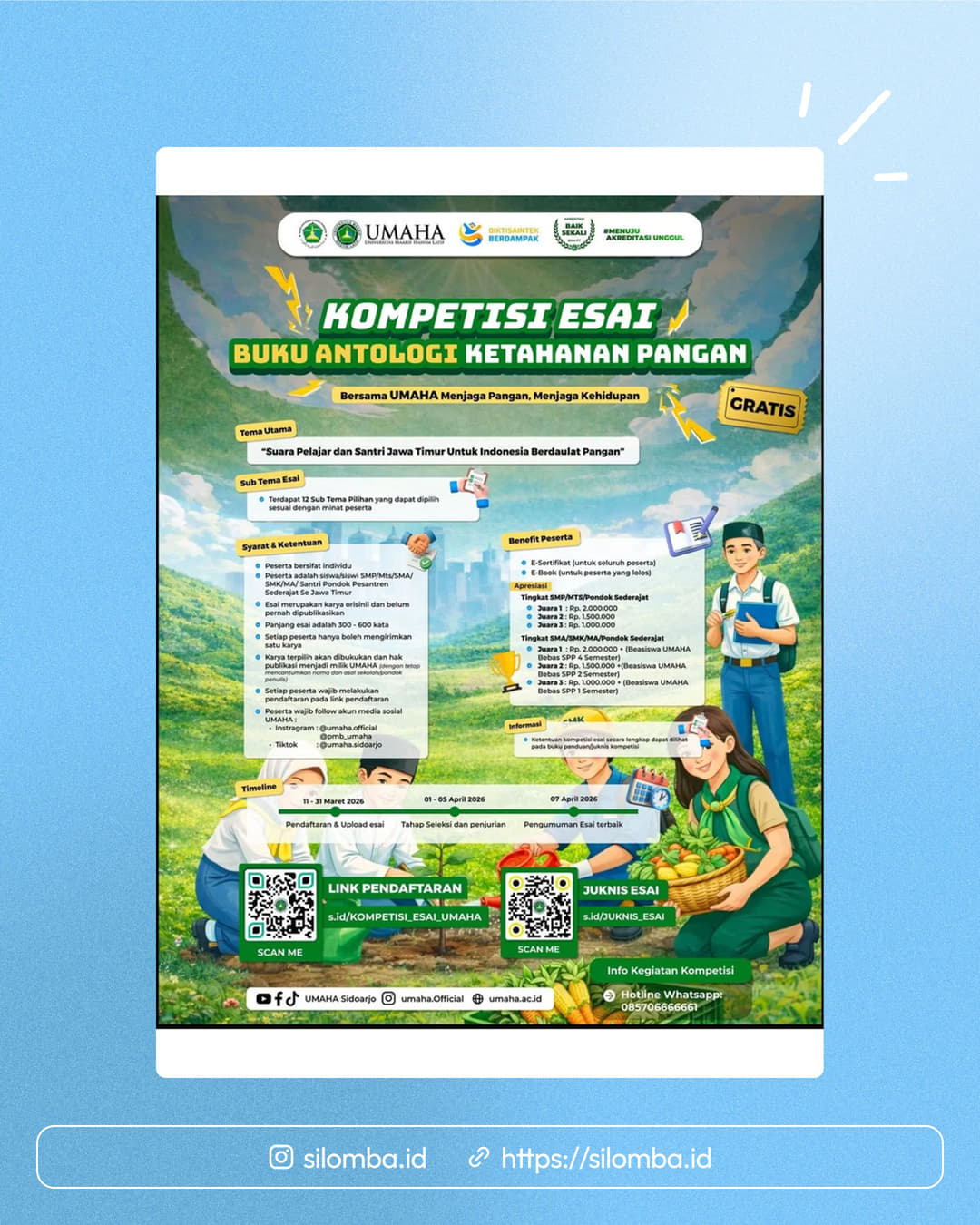 Esai merupakan karya orisinal dan belum pernah dipublikasikan.Siswa SMP/MTs/SMA/SMK/MA/Santri pondok pesantren sederajat se Jawa Timur.