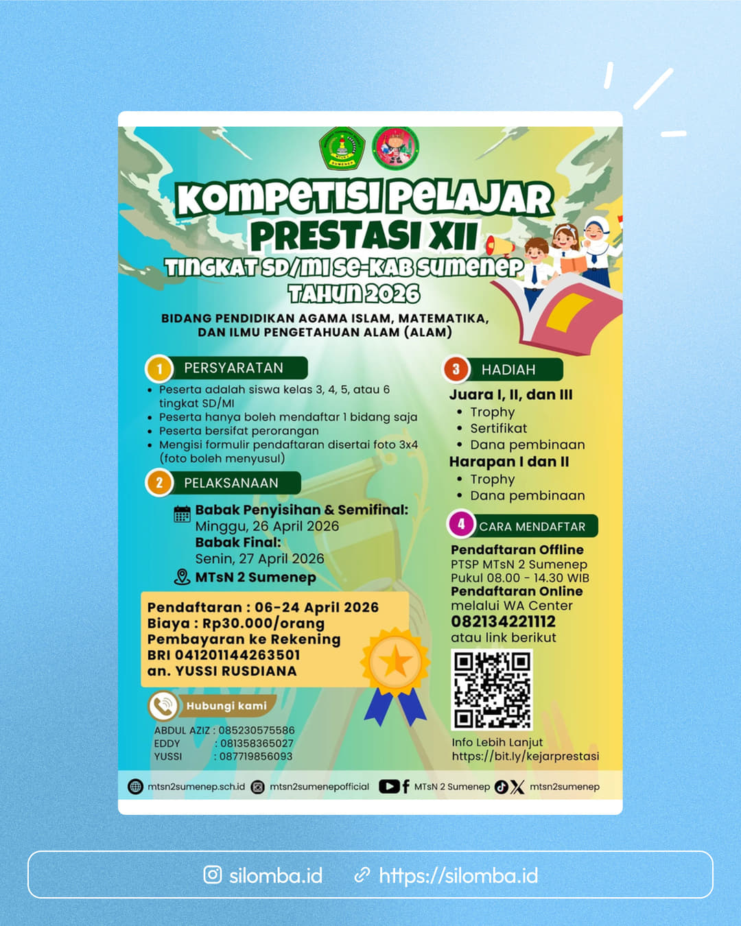 Peserta adalah siswa kelas 3, 4, 5, atau 6 tingkat SD/MIPeserta hanya boleh mendaftar 1 bidang sajaPeserta bersifat peroranganMengisi formulir pendaftaran disertai foto 3x4 (foto boleh menyusul)