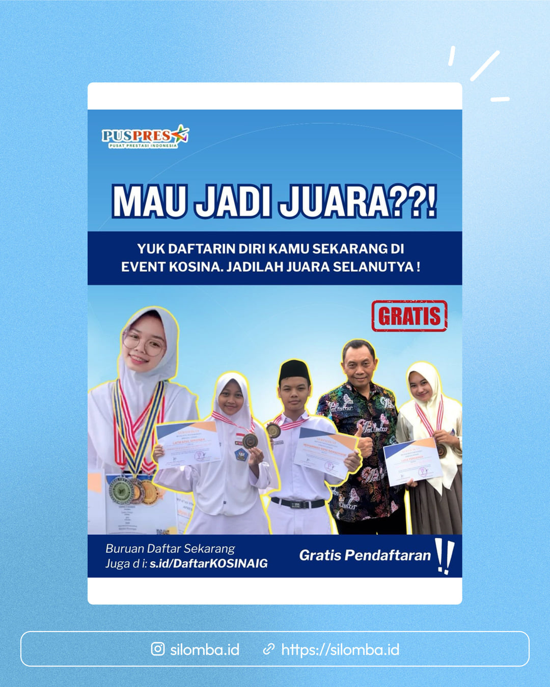 Follow Instagram puspresaTag 10 teman kamu di kolom komentar postingan instagram puspresaRepost postingan poster KOSINA di instagram puspresaShare ke story Instagram kamu dan tag akun puspresa