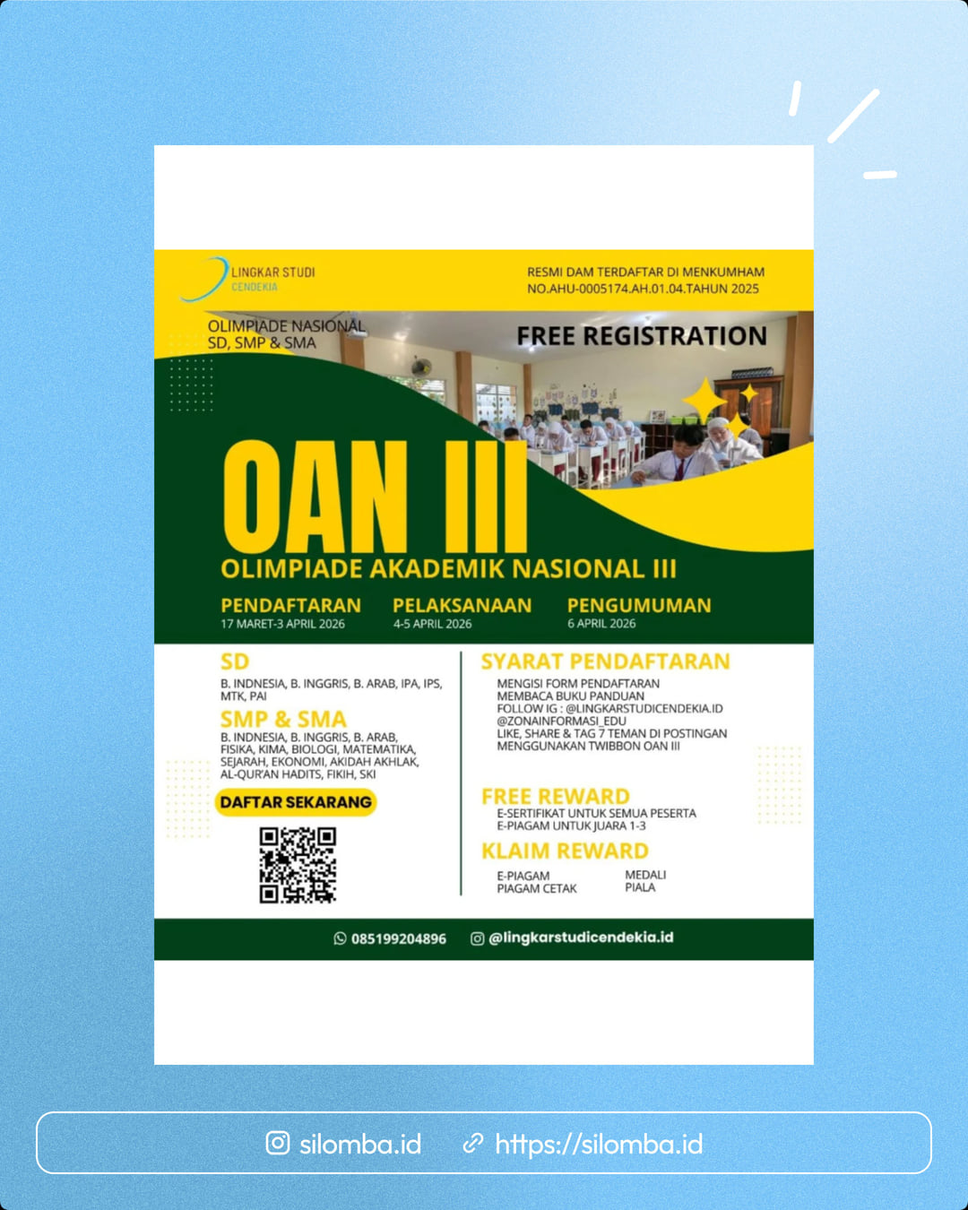 Event ini berskala nasional dan dilaksanakan secara online yang bisa diikuti oleh siswa-siswi SD/MI/Sederajat(kelas 4-6), SMP/MTS/Sederajat dan SMA/MA/Sederajat