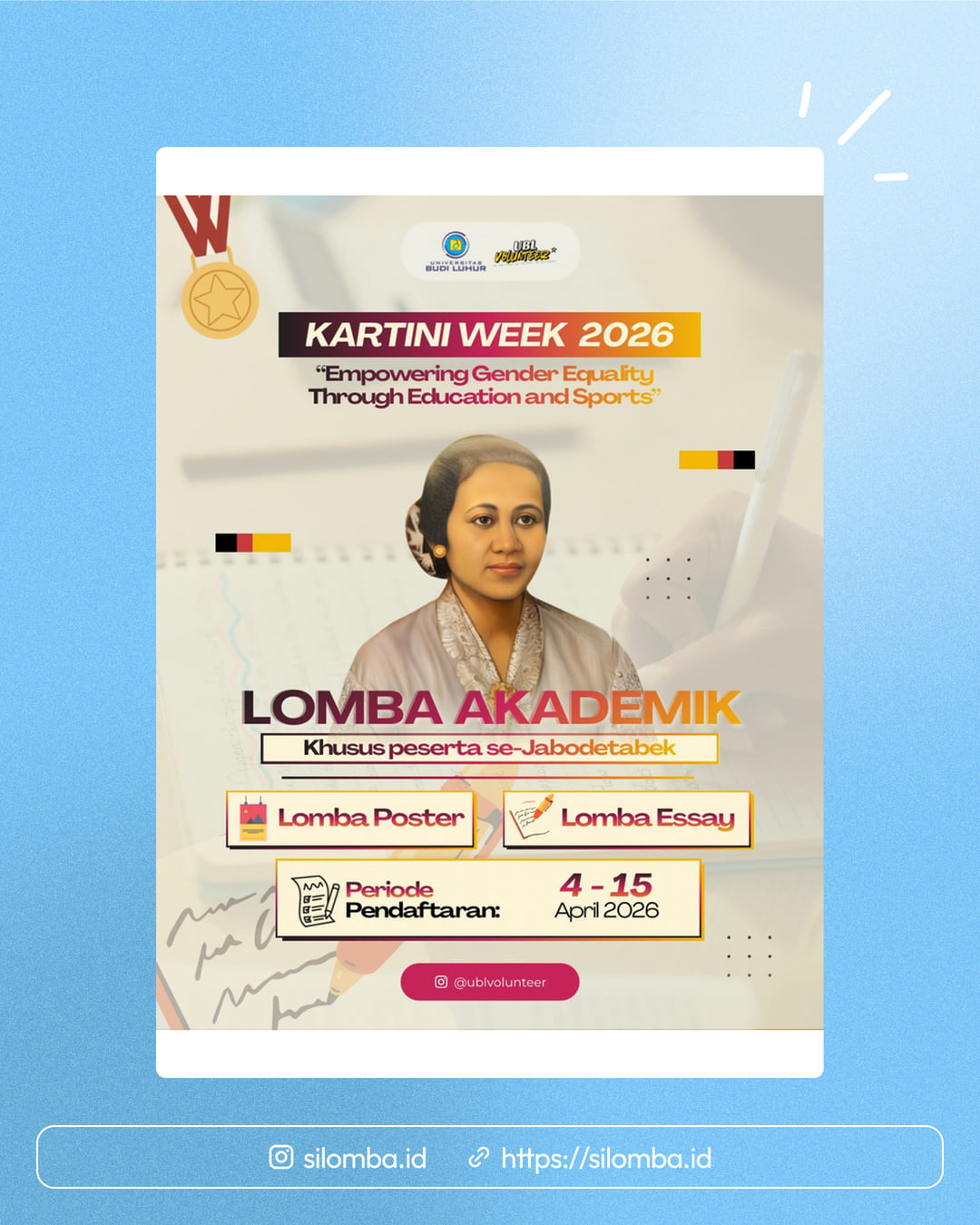 β¨ KARTINI WEEK 2026 IS HERE! β¨ Saatnya suara kamu didengar, ide kamu dilihat, dan karya kamu berdampak! π₯ Dalam rangka Kartini Week 2026, kami mengajak kamu untuk ikut berpartisipasi dalam Lomba Akademik dengan tema: π― βEmpowering Gender Equality Through Education and Sportsβ π‘ Pilih kategori yang paling cocok buat kamu: π Lomba Essay π¨ Lomba Poster π Khusus untuk kamu yang berdomisili di Jabodetabek π Periode pendaftaran: 4 β 15 April 2026 Kenapa harus ikut? π Dapat uang pembinaan + sertifikat π Kesempatan tampil di main event Kartini Week 2026 π Semua peserta dapat e-sertifikat Ini bukan sekadar lomba, tapi ruang buat kamu menyuarakan gagasan tentang kesetaraan, pendidikan, dan peran generasi muda π π₯ Jangan cuma jadi penonton, jadi bagian dari perubahan! π² Daftar sekarang & kirim karya terbaikmu! π© Info lebih lanjut: DM atau hubungi CP di slide terakhir #KartiniWeek2026 #LombaMahasiswa #LombaPelajar Silomba hanya media informasi lomba. Untuk info lebih lanjut, silakan hubungi penyelenggara.