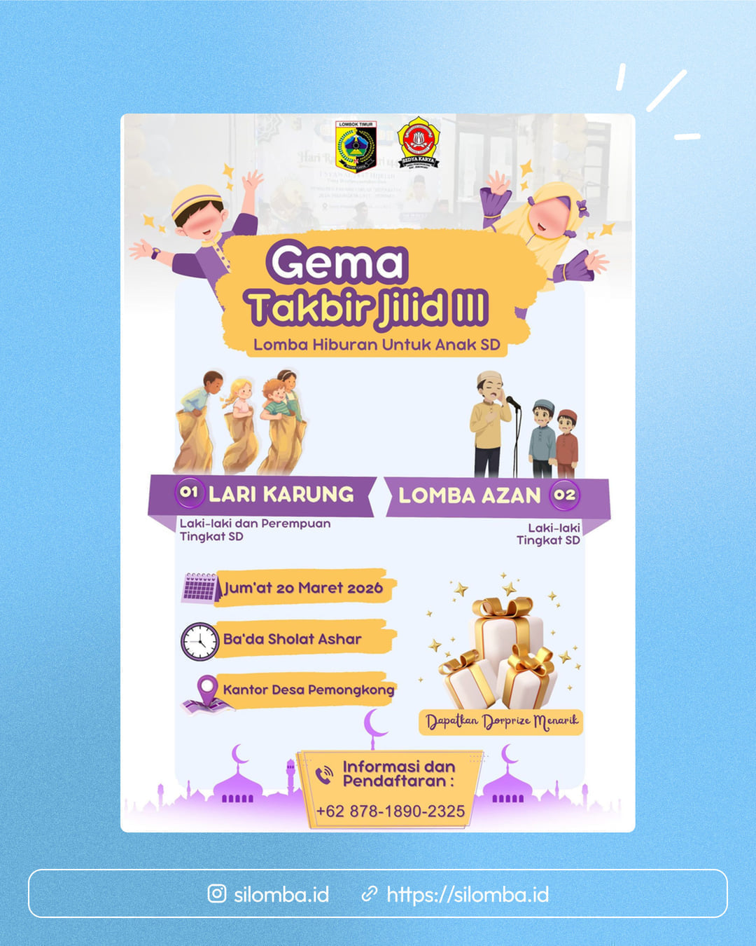 Khusus masyarakat Desa pemongkong Bagi yang punya anak Tingkat SD Segera Daftar dan Ikuti lomba Nanti sore Di Kantor Desa..