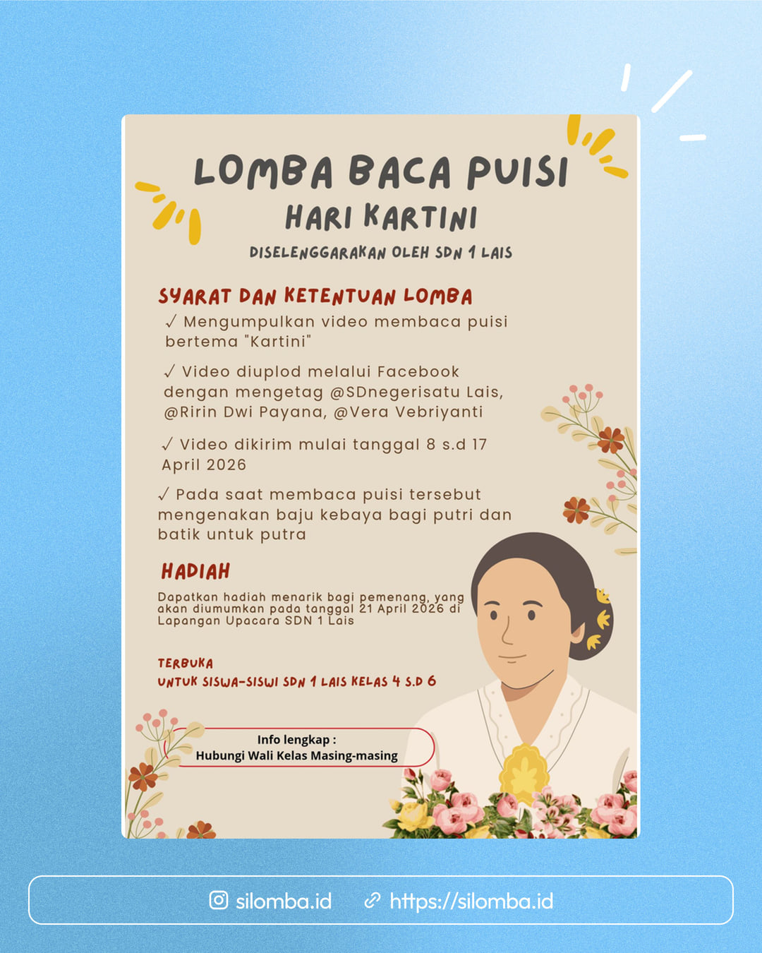 Video diupload melalui Facebook dengan mention @SDnegerisatu Lais, @Ririn Dwi Payana, @Vera VebriyantiVideo dikirim mulai tanggal 8 s.d 17 April 2026Pada saat membaca puisi tersebut mengenakan baju kebaya bagi putri dan batik untuk putra