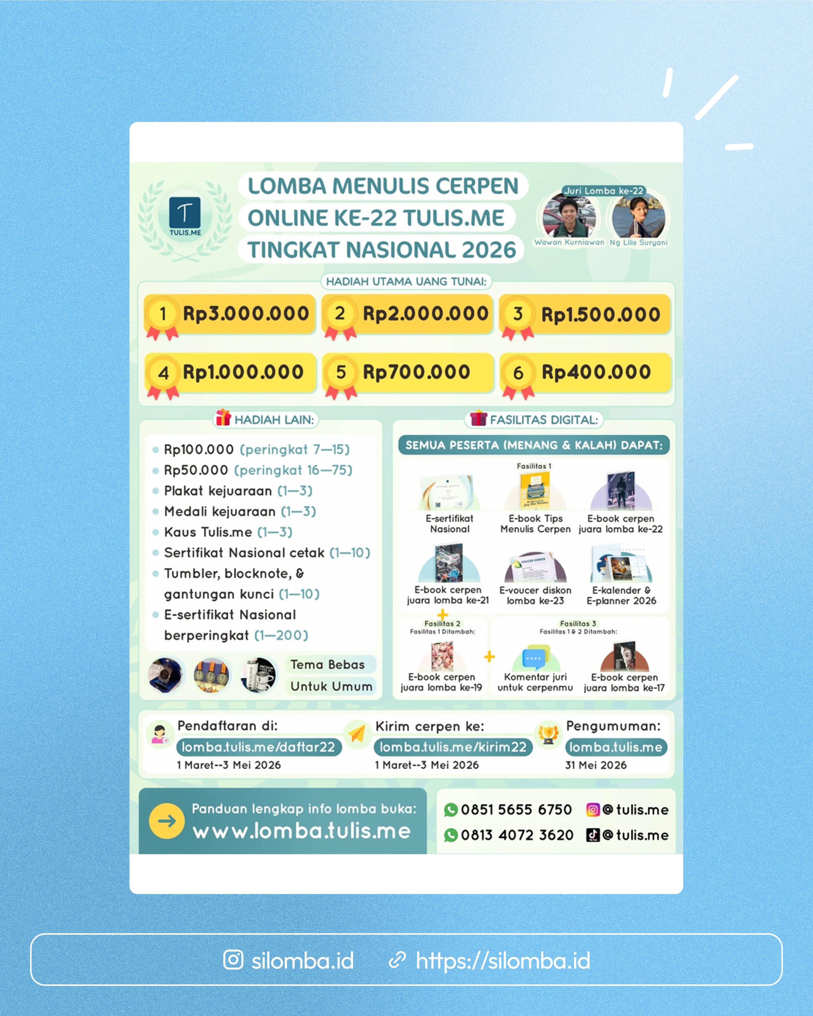 Penulisan cerpen di aplikasi Microsoft WordHuruf Calibri ukuran 11Minimal 1 halaman, maksimal 15 halaman