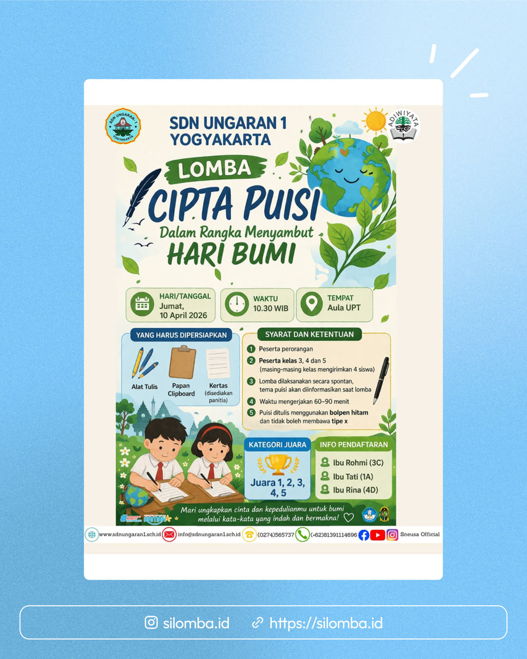 Lomba bersifat peroranganTema puisi akan diberikan saat lombaWaktu pengerjaan 60ā90 menitDitulis dengan bolpoin hitam (tanpa tipe-x)