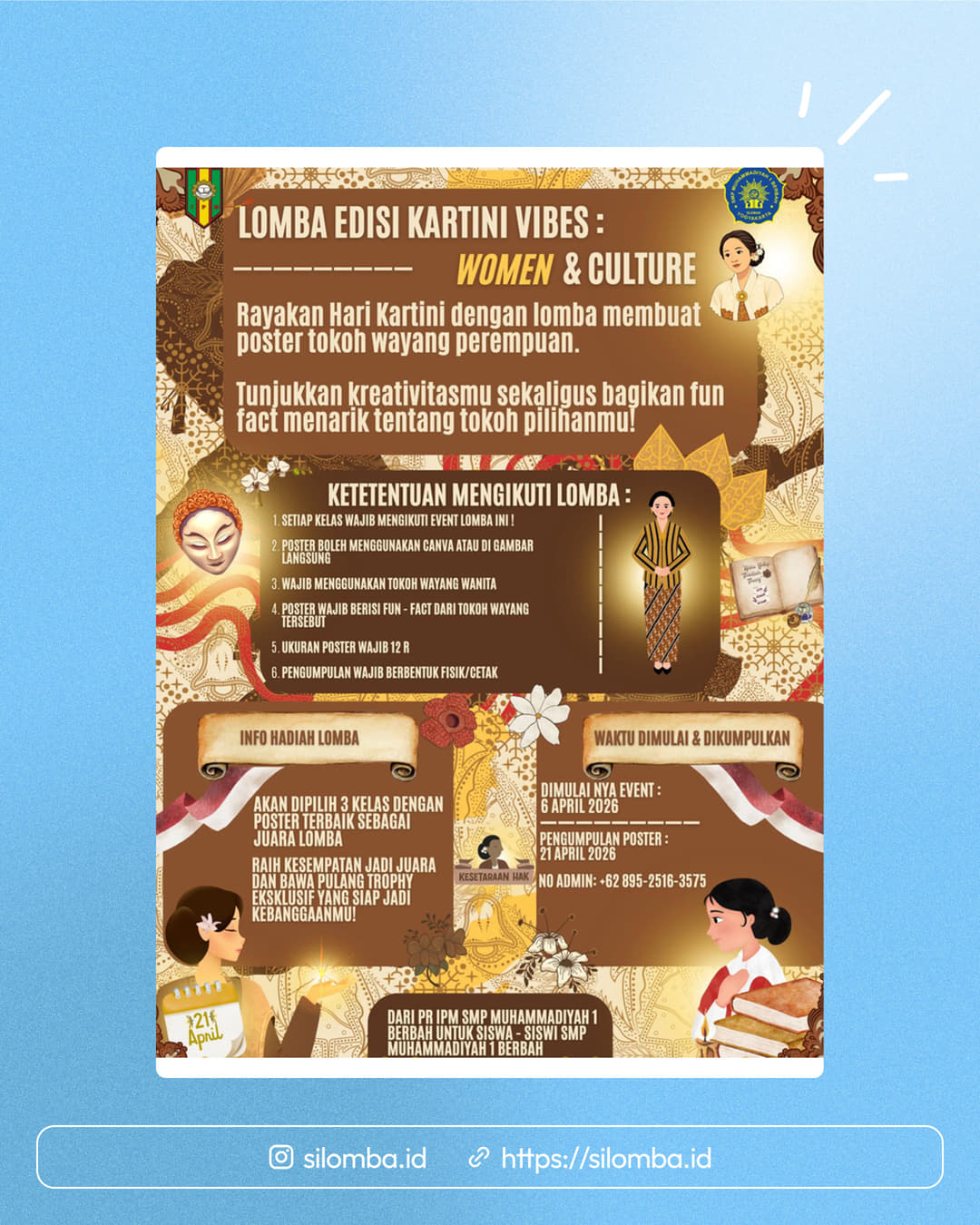 Poster boleh menggunakan Canva atau gambar langsung.Wajib menggunakan tokoh wayang wanita.Poster wajib berisi fun-fact dari tokoh wayang tersebut.Ukuran poster wajib 12 R.Pengumpulan wajib berbentuk fisik/cetak.