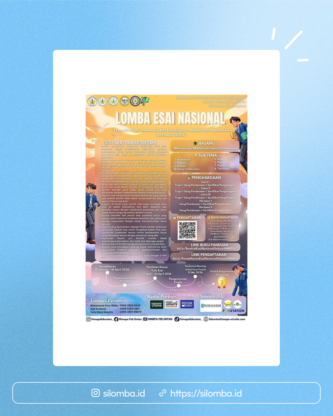 Tema: Transformasi Indonesia Berkelanjutan melalui Ide Mahasiswa Berbasis SDGsSubtema: Pendidikan, Ekonomi, Budaya, Politik, Kesehatan, Energi Terbarukan, Pertanian, dan Teknologi