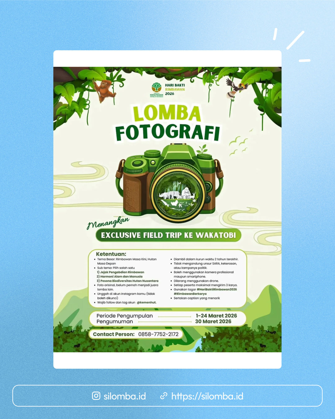 Dalam rangka memperingati Hari Bakti Rimbawan 2026, Kementerian Kehutanan mengajak Sobat Hijau untuk ikut serta dalam Lomba Fotografi Hari Bakti Rimbawan 2026.