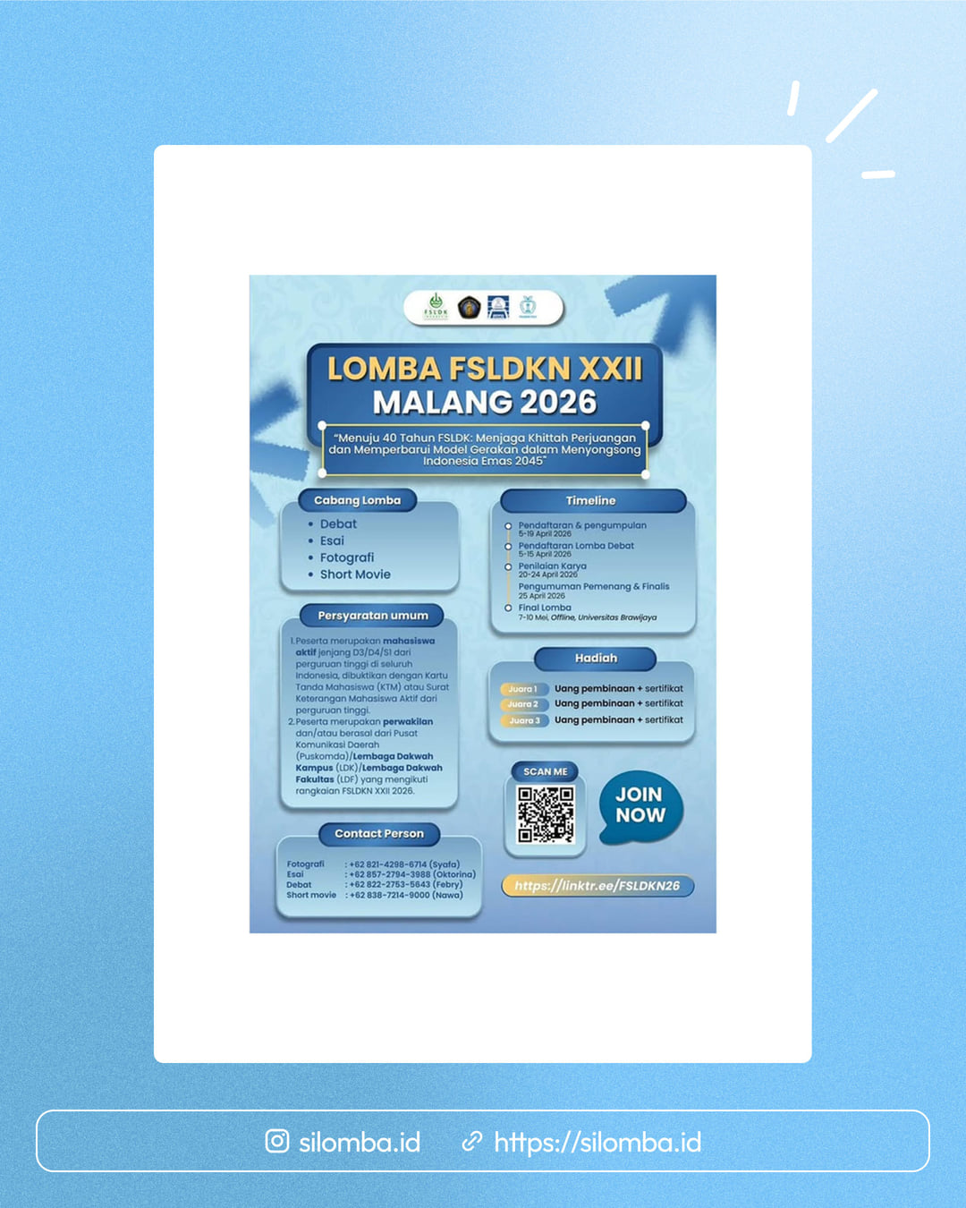 Mahasiswa aktif D3/D4/S1 seluruh IndonesiaDibuktikan dengan KTM/surat keterangan aktifMerupakan perwakilan atau bagian dari Puskomda/LDK/LDF yang mengikuti rangkaian FSLDKN XXII 2026