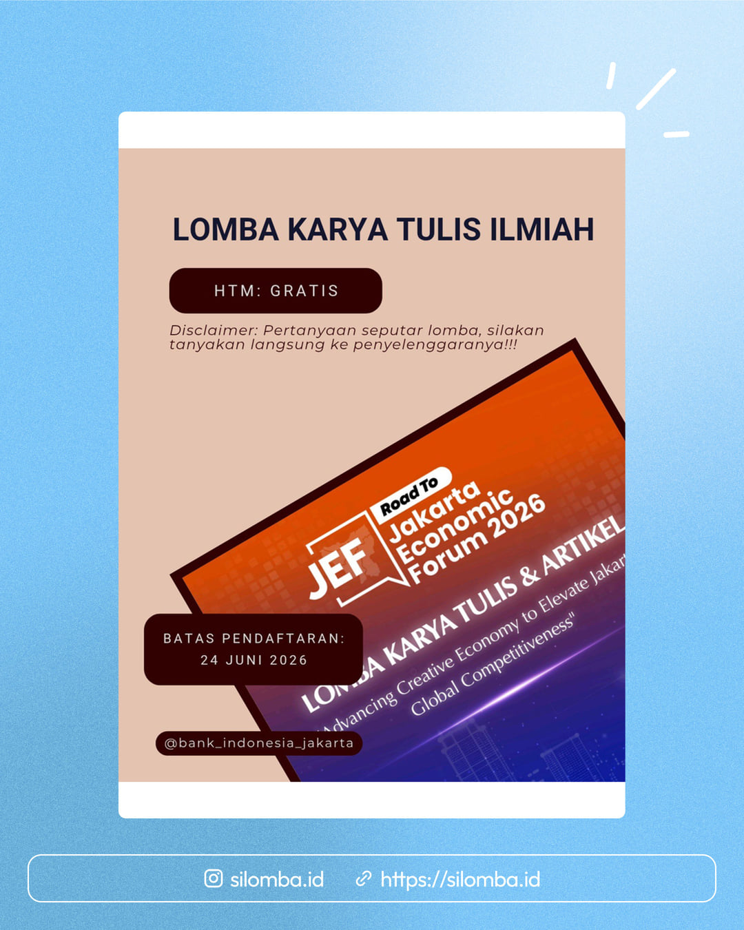 Punya pemikiran kritis atau ide kreatif untuk masa depan Jakarta? Saatnya tuangkan gagasanmu melalui Lomba Karya Tulis dan Artikel Jakarta Economic Forum (JEF) 2026 dengan tema “Advancing Creative Economy to Elevate Jakarta’s Global Competitiveness”.