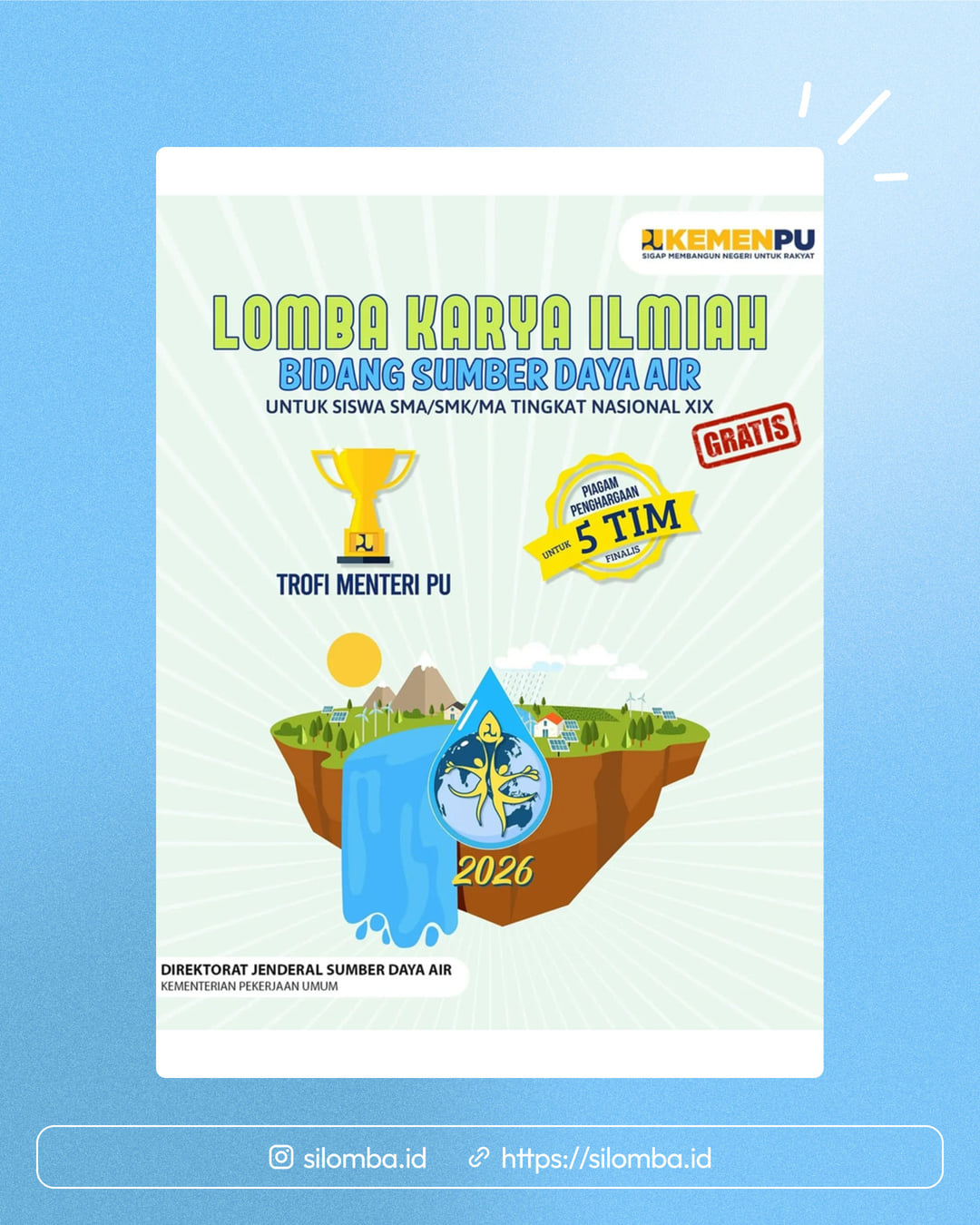 Direktorat Jenderal Sumber Daya Air Kementerian Pekerjaan Umum mengajak pelajar SMA/SMK/MA untuk ikut Lomba Karya Tulis Ilmiah Tingkat Nasional Bidang Sumber Daya Air!