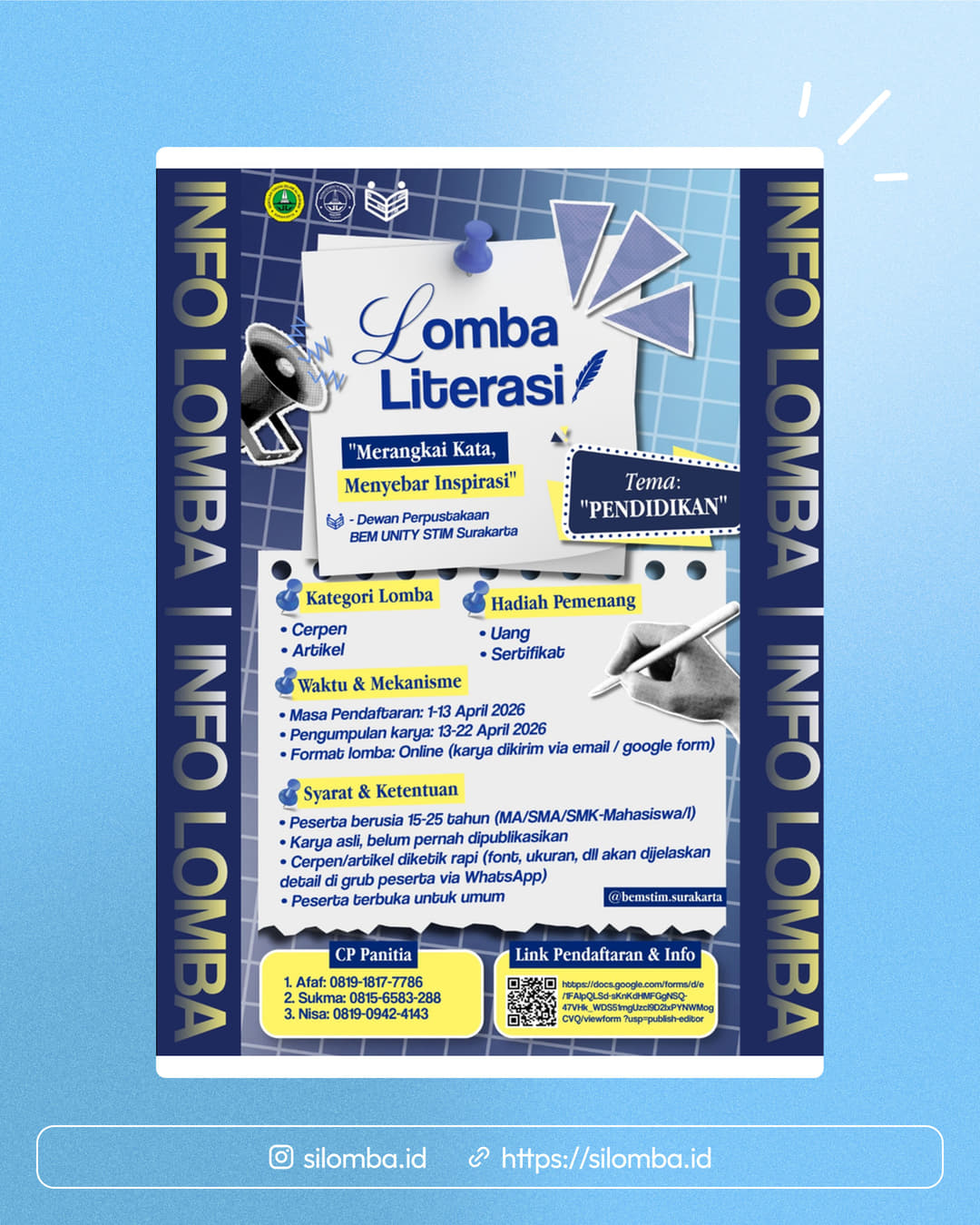 Karya bersifat orisinal dan belum pernah dipublikasikanNaskah diketik rapi (format lengkap akan diinformasikan melalui grup WhatsApp peserta)