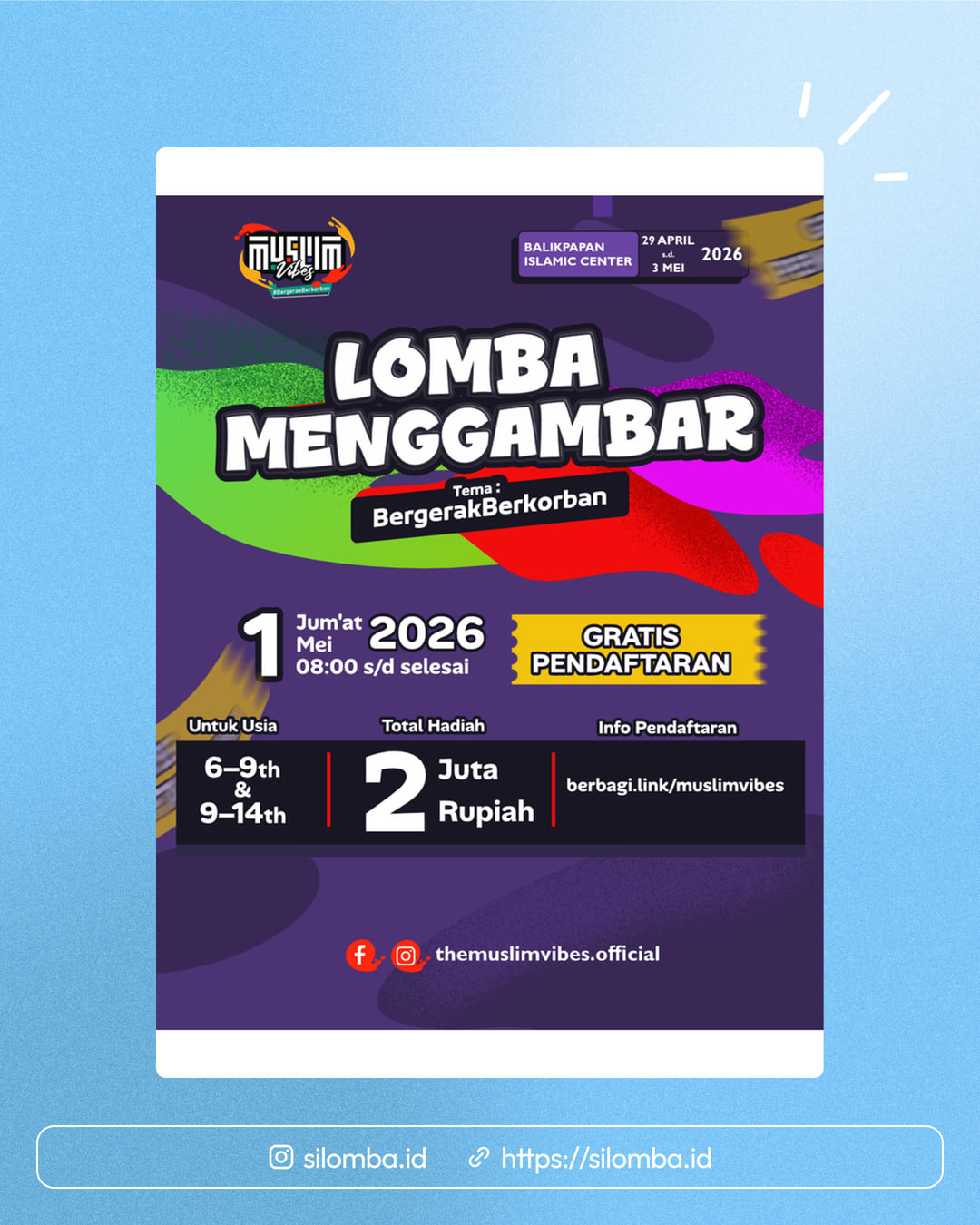 Hai Muslim Kids! Yuk ikutan Lomba Menggambar di Muslim Vibes 5.0! 🎨 Tema kita: “Bergerak Berkorban” 💖 Tunjukkan imajinasi terbaikmu ya! 🌟 Jangan lupa ajak teman-temanmu juga! 📩 Daftar sekarang juga! 🏆 Yuk #BergerakBerkorban bareng 🤍 ————————— Muslim Vibes 5.0 One Stop Muslim Lifestyle Festival #BergerakBerkorban 📆 29 April - 3 Mei 2026 📍Balikpapan Islamic Center Presented by goodmuslim.official ———— Follow themuslimvibes.official Follow themuslimvibes.official Follow themuslimvibes.official #muslimvibesbpn #eventbalikpapan #lombamenggambar Silomba hanya media informasi lomba. Untuk info lebih lanjut, silakan hubungi penyelenggara.