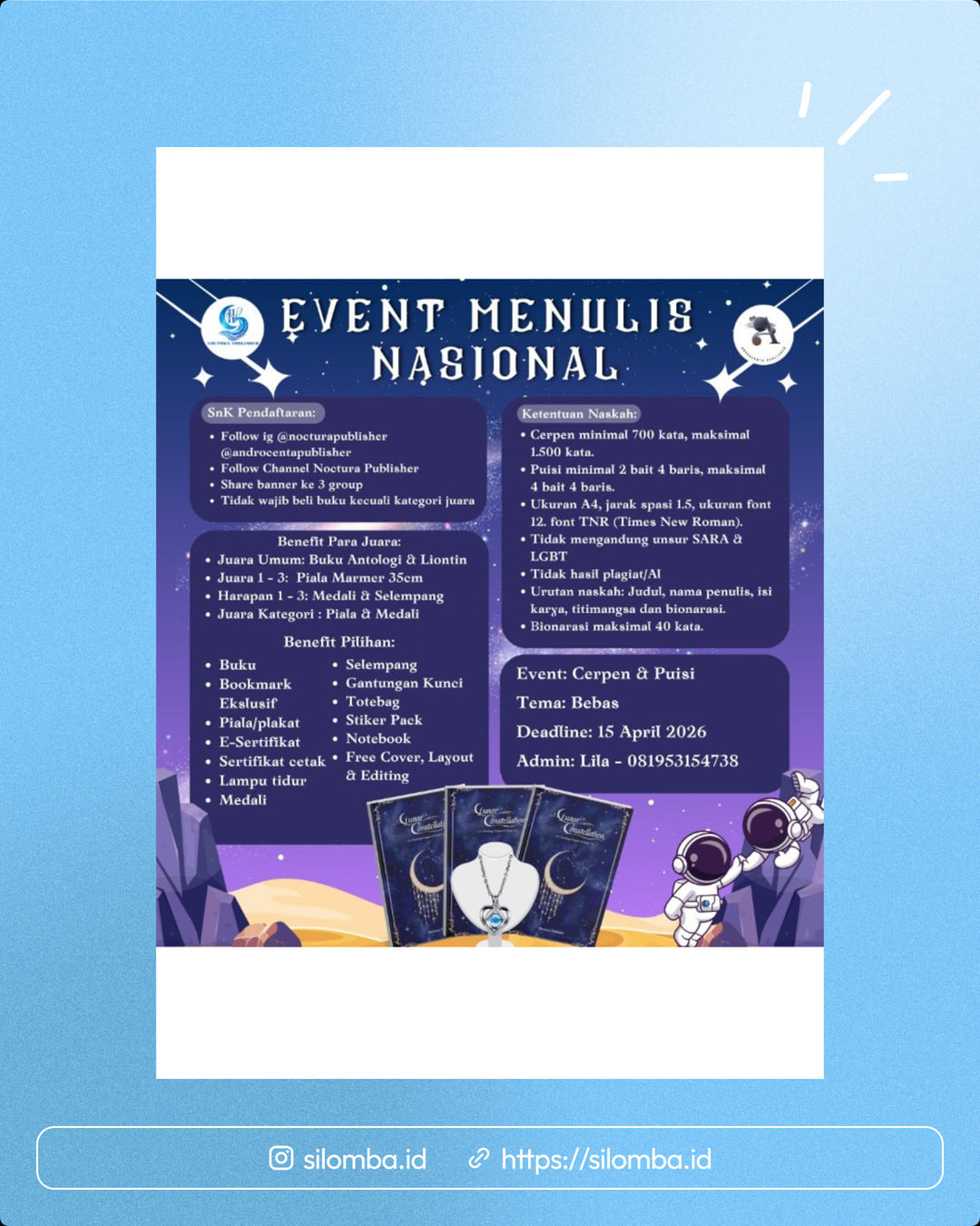 #lomba #infolomba #kepenulisan #penulis #lombanulis #eventlomba #eventlomba_info #penulisindonesia #lombaindonesia #lombamenulispuisi #lombamenuliscerpen #lombamenulisgratis #lombaantologi #bukuantologi #antologipuisi #antalogicerpen