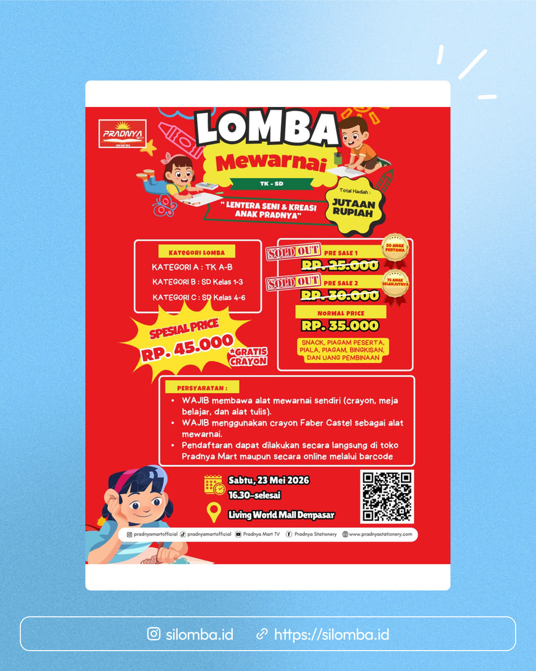 WAJIB menggunakan CRAYON FABER CASTELLMembawa alat mewarnai sendiri (crayon, meja belajar, dan alat tulis)Media berukuran A4