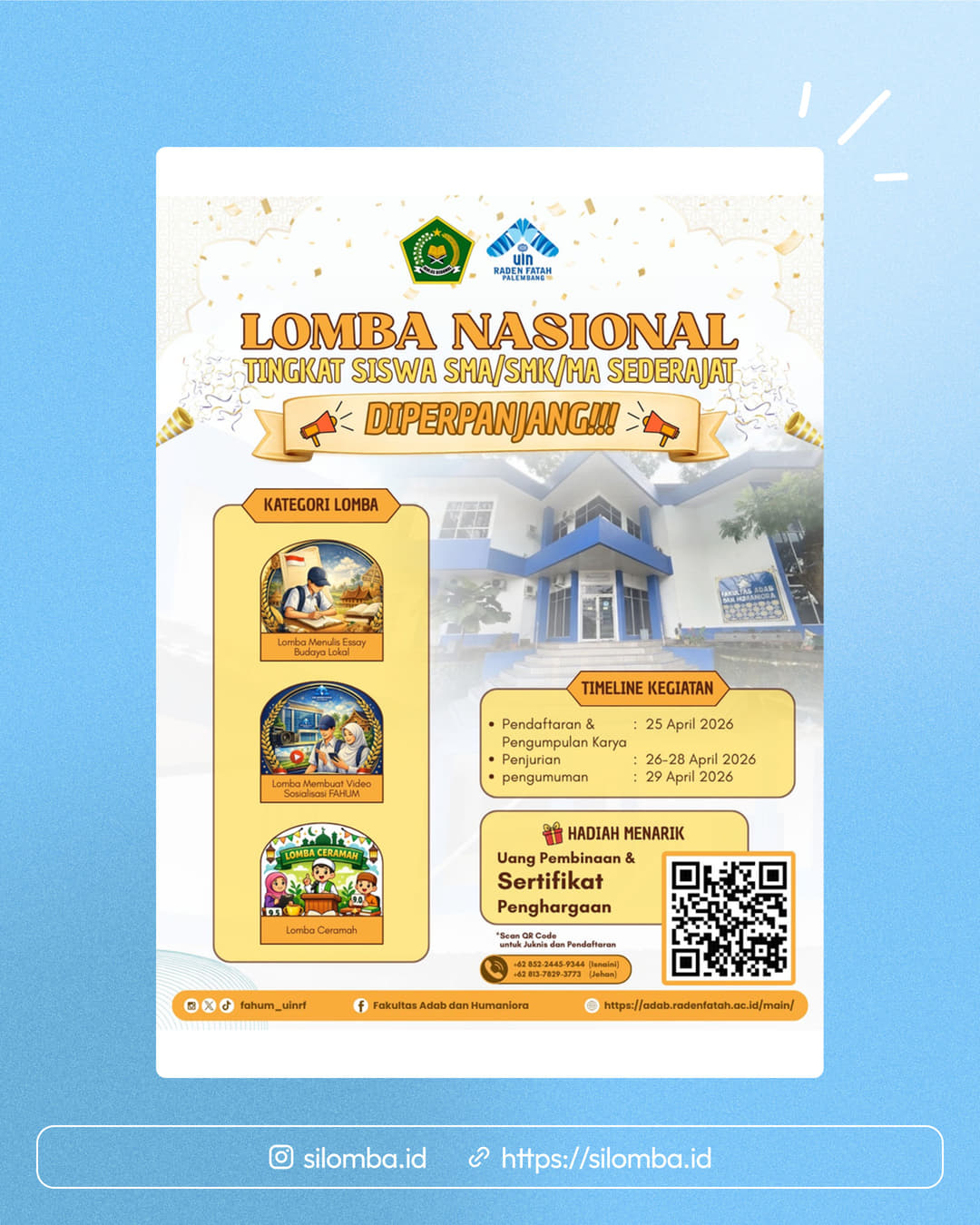 Sehubungan dengan tingginya antusiasme peserta, maka Lomba Nasional Tingkat SMA/SMK/MA Sederajat Fakultas Adab dan Humaniora UIN Raden Fatah Palembang RESMI DIPERPANJANG š