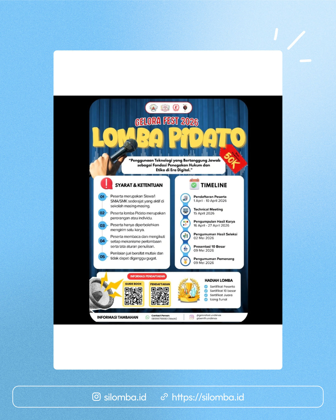 Peserta lomba Pidato merupakan perorangan atau individu.Peserta hanya diperbolehkan mengirim satu karya.Peserta membaca dan mengikuti setiap mekanisme perlombaan serta tata aturan penulisan.Penilaian juri bersifat mutlak dan tidak dapat diganggu gugat.