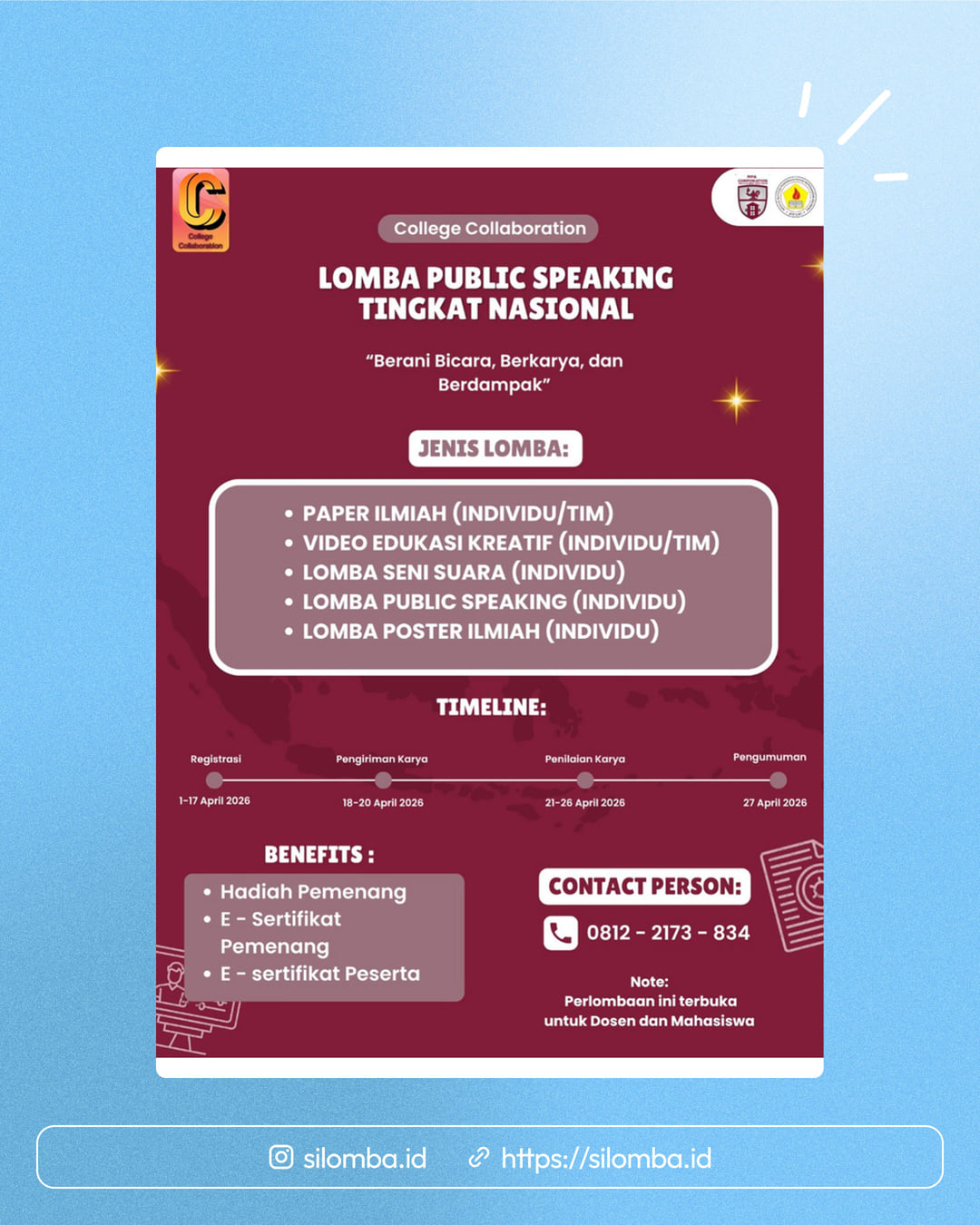 Jangan lewatkan kesempatan ini untuk mengasah kemampuan, menambah pengalaman, dan menunjukkan potensi terbaikmu di bidang public speaking!