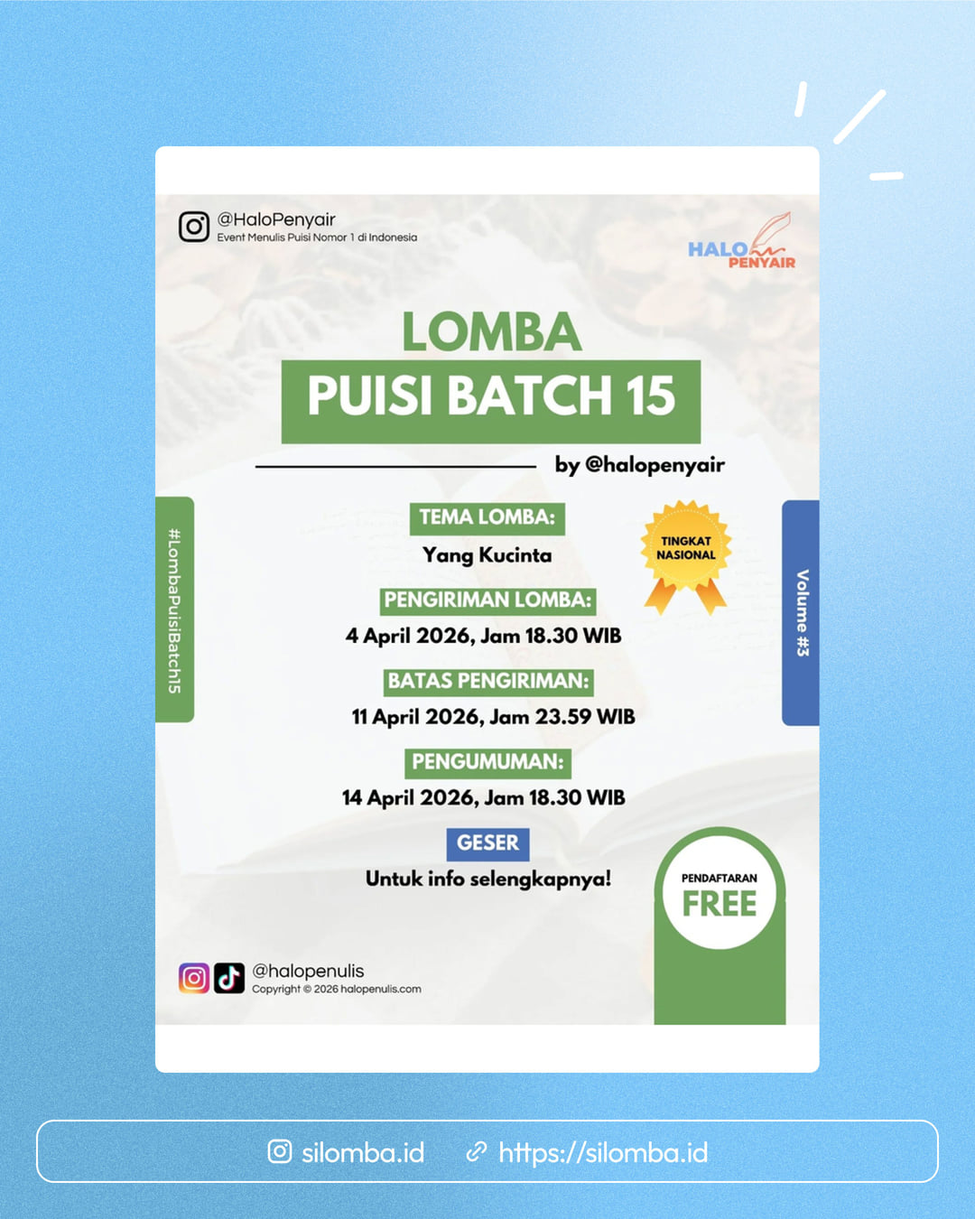 Follow Instagram halopenyair dan halo_bookstoreRepost postingan ke story IG, tag halopenyair & halo_bookstoreTulis "Ayo Bersajak" dan tag 5 teman