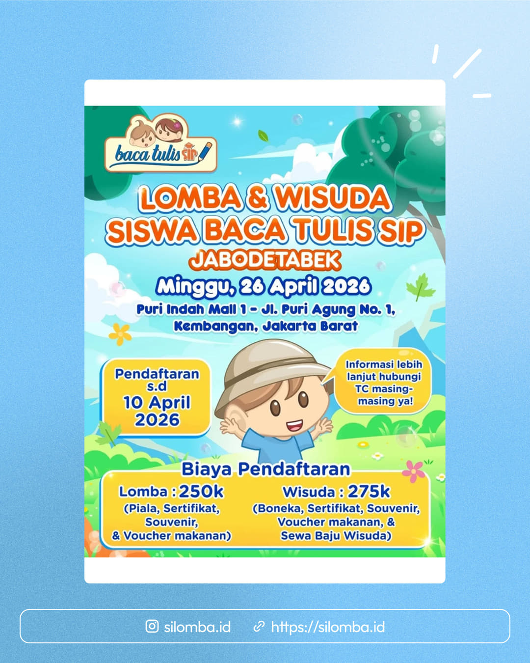 Haaai sahabat baca Tulis SIP Ada kabar gembira! Bulan April nanti Baca Tulis SIP akan mengadakan lomba siswa kembali lhoo, tepatnya pada tanggal 26 April 2026 di Puri Indah Mall 1, Kembangan, Jakarta Barat 🌺 Mau tau keseruannya seperti apa? Yuk, segera daftar dan ikuti kegiatannya Untuk info lebih lanjut, adik-adik bisa hubungi TC masing-masing ya! 🍀 See youuu :)