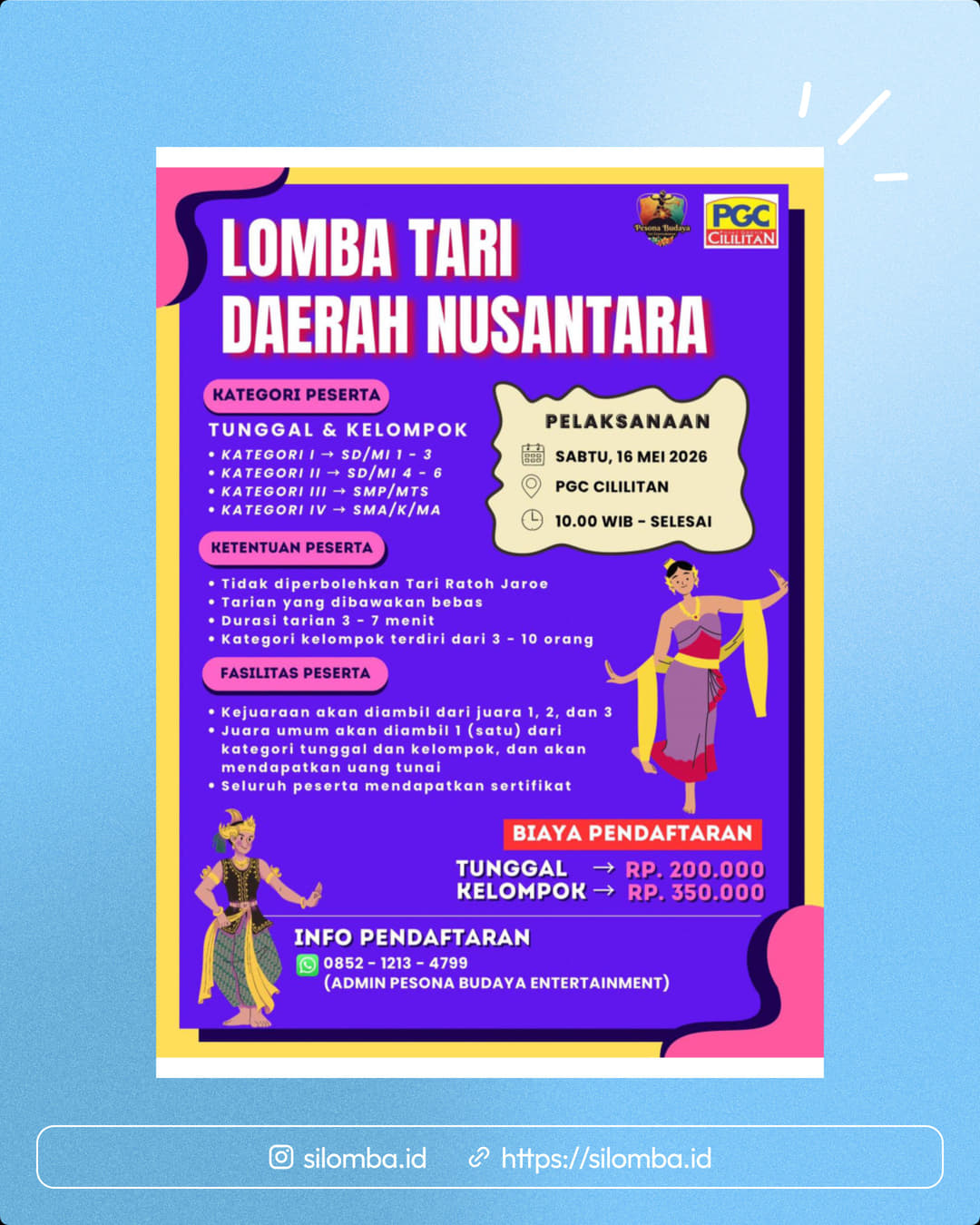 Pesona Budaya Entertainment mengadakan Lomba Tari Daerah Nusantara sebagai ajang perlombaan menyalurkan bakat, kreativitas, serta melestarikan budaya yang ada di Indonesia.
