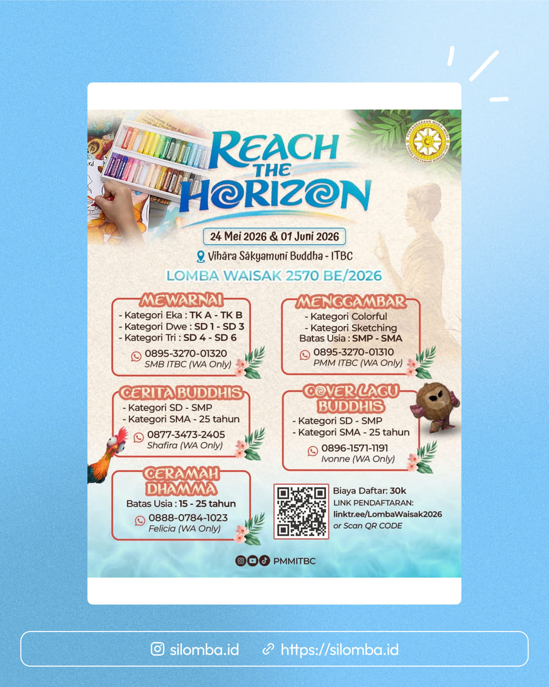 Kesempatan bagus untuk mengasah kreativitas dan kemampuan dalam rangka memperingati hari Waisak yg ke 2570 BE/2026, PMM ( Persaudaraan Muda Mudi ) ITBC menyelenggarakan Lomba yang bertemakan ”REACH THE HORIZON“. Akan dinilai oleh juri-juri berpengalaman di bidangnya dan tentunya dengan hadiah yang menarik.