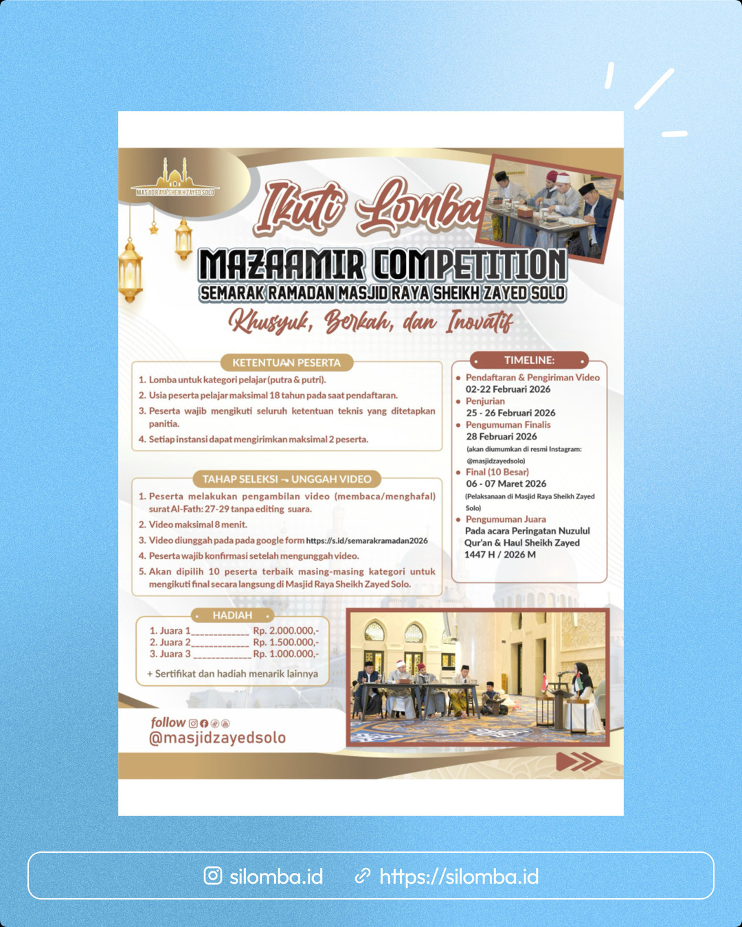 Melalui Mazaamir Competition 2026, Masjid Raya Sheikh Zayed Solo mengajak para pelajar untuk menghadirkan bacaan terbaik, adab terbaik, dan niat terbaik dalam satu ruang yang penuh keberkahan.